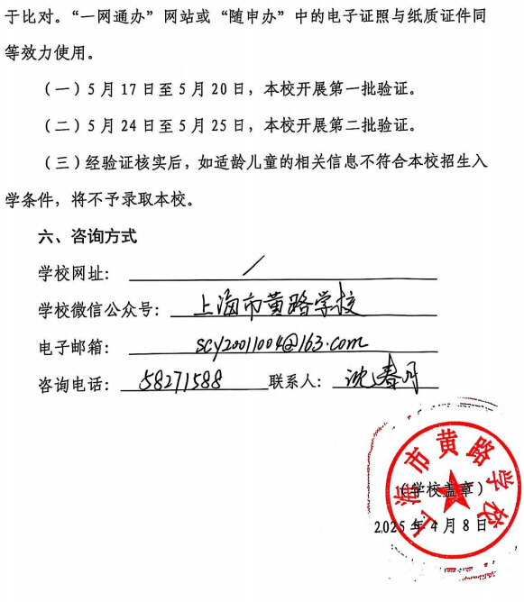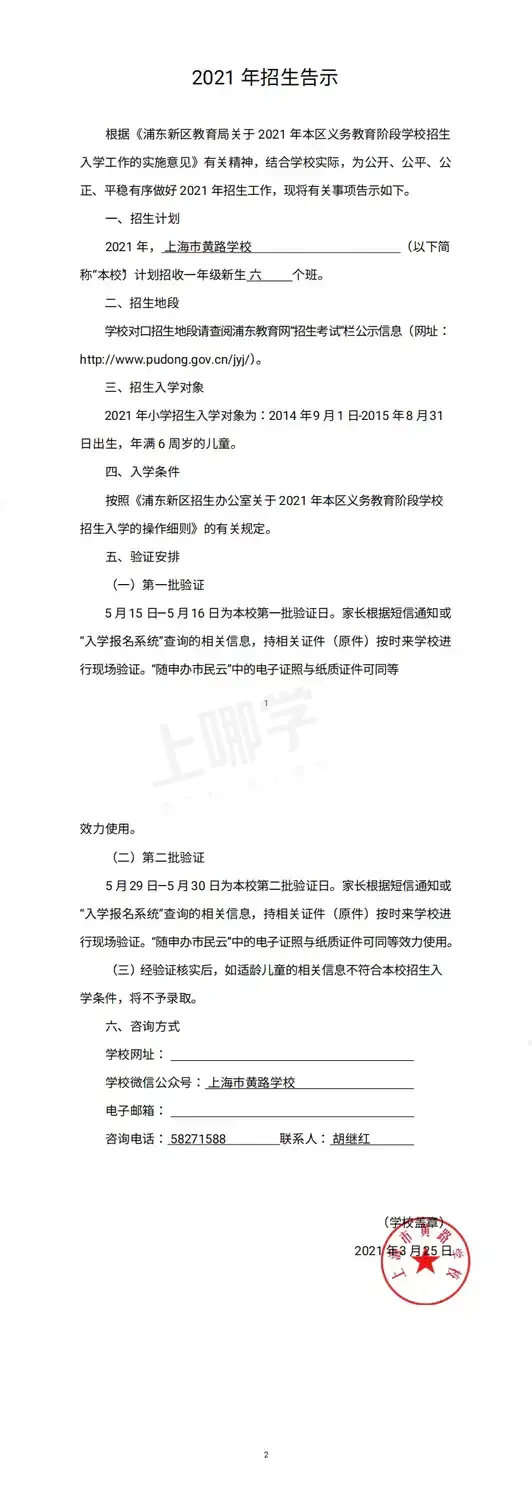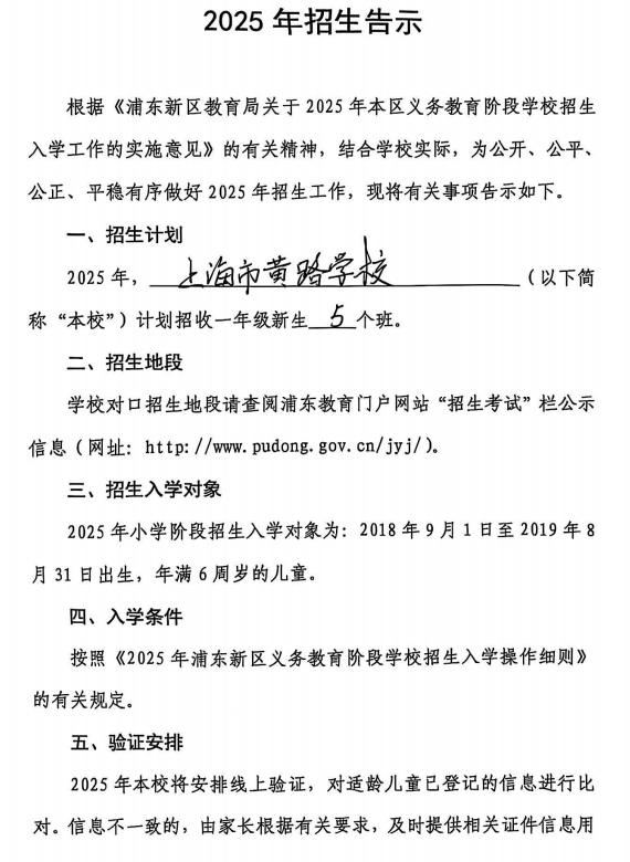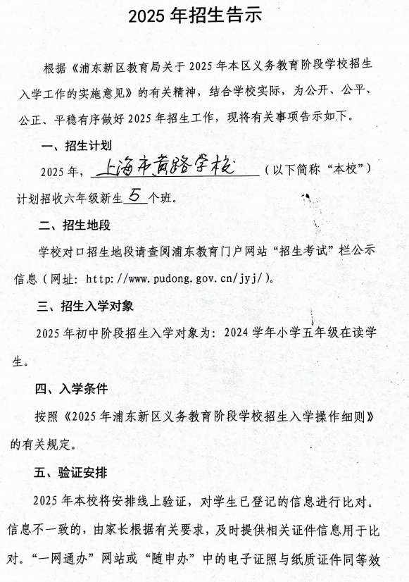 备注:根据浦东新区教育局招生工作规定:原黄路学校五年级学生原则上直接升入本校初中部。另,我校无论小学一年级还是预备年级均衡分班;不举行任何形式的测试、面试等;不收取任何学生的简历等材料;招生录取不与任何教育培训机构挂钩,并接受社会监督。