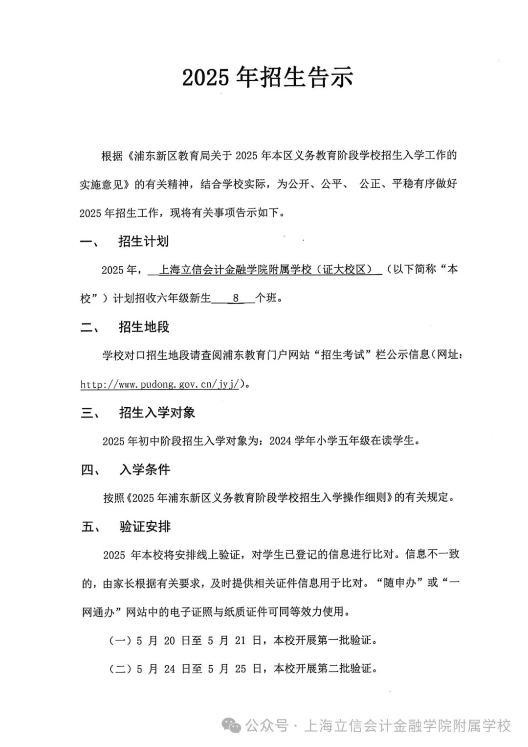 2022 年招生告示(小学部) 根据《浦东新区教育局关于 2022 年本区义务教育阶段学校招生入学工作的实施意见》的有关精神,结合学校实际,为公开、公平、公正、平稳有序做好 2022 年招生工作,现将有关事项告示如下。 一、招生计划 2022 年,上海立信会计金融学院附属学校(东陆校区)(以下简称“本校”)计划招收一年级新生 3个班。 二、招生地段 学校对口招生地段请查阅浦东教育门户网站“招生考试”栏公示信息(网址:http://www.pudong.gov.cn/jyj/)。 三、招生入学对象 2022 年小学招生入学对象为:2015年9月1日—2016 年8月31 日出生,年满 6 周岁的儿童。 四、入学条件 按照《2022 年浦东新区义务教育阶段学校招生入学操作细则》的有关规定。 五、验证安排 2022 年本校将安排线上验证,对适龄儿童已登记的信息进行比对。信息不一致的,由家长根据有关要求,及时提供相关证件信息用于比对。“随申办市民云”或“一网通办”网站中的电子证照与纸质证件可同等效力使用。 (一)7月4日—7月10日为本校第一批验证日。 (二)7月25日—7月26日为本校第二批验证日。 (三)经验证核实后,如适龄儿童的相关信息不符合本校招生入学条件,将不予录取。 六、咨询方式 学校网址:http://www.lxfx.pdedu.sh.cn/ 学校微信公众号:上海立信会计金融学院附属学校 电子邮箱:lxfxdlgh@163.com 咨询电话:50421762 联系人:陆老师