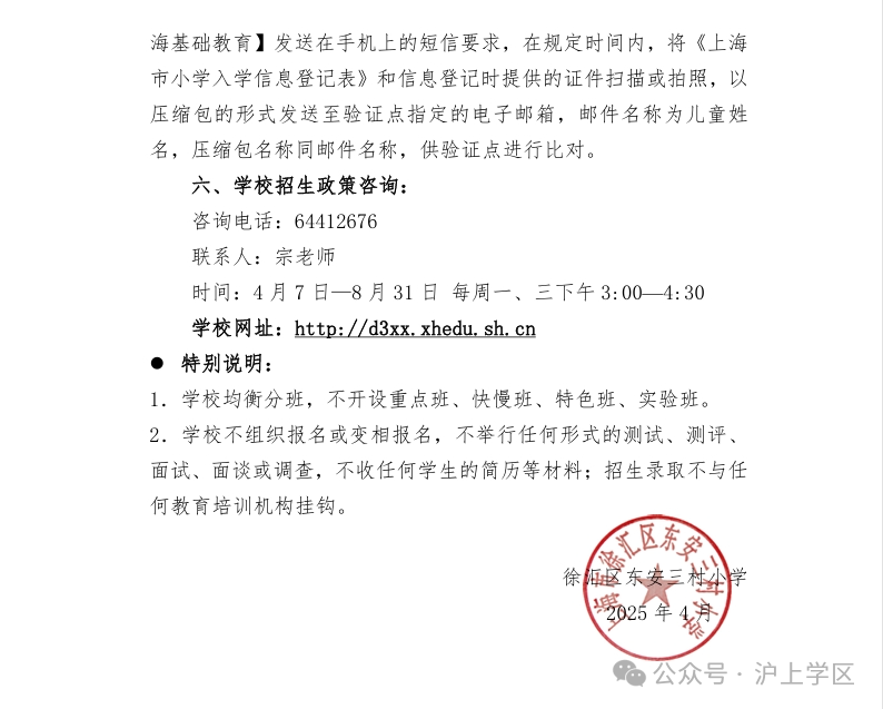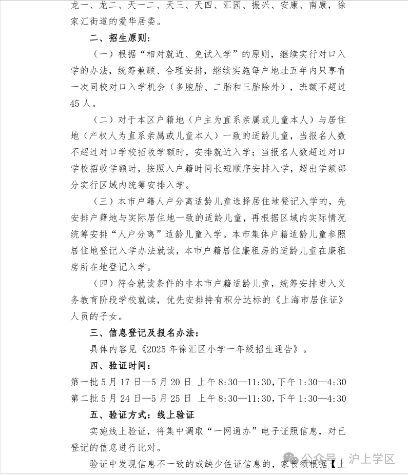 具体内容见《2020年度徐汇区小学一年级招生通告》