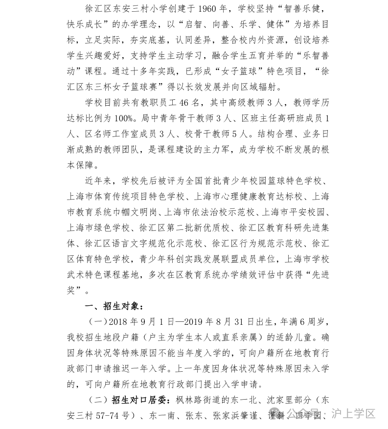 (二)招生对口居委:枫林街道的安康、东一北、东一南、汇园、谨斜、龙一、龙二、沈家里部分(限东安三村57-74号)、四季园、天一二、天三、天四、张东、张家浜、振兴居委、徐家汇街道的爱华居委。