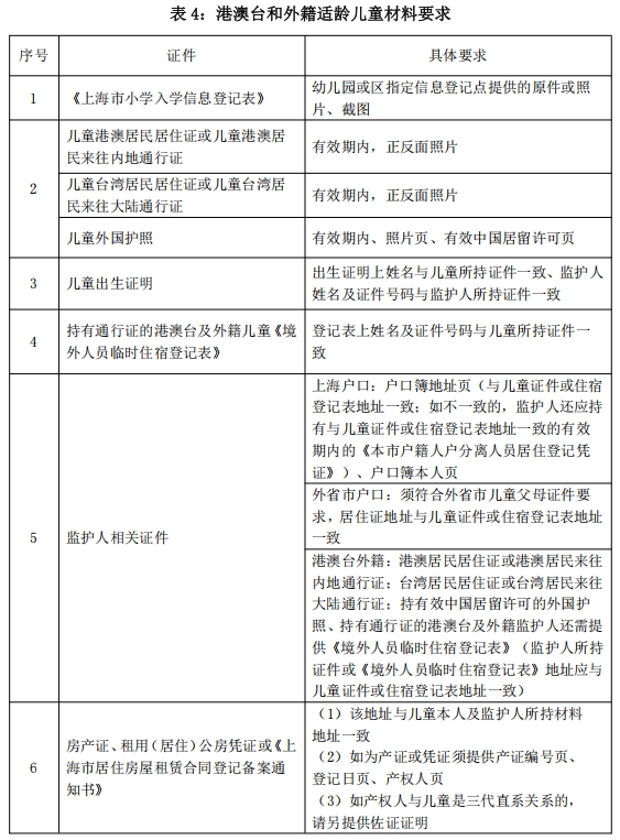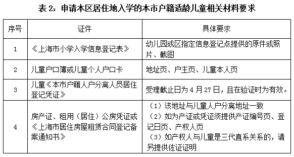 表4:申请本区居住地入学的本市户籍适龄儿童相关材料要求