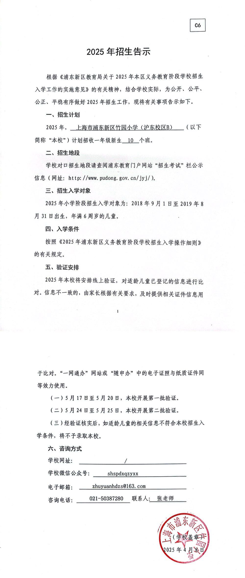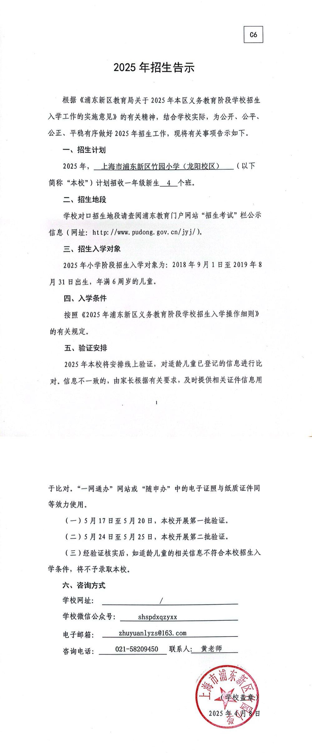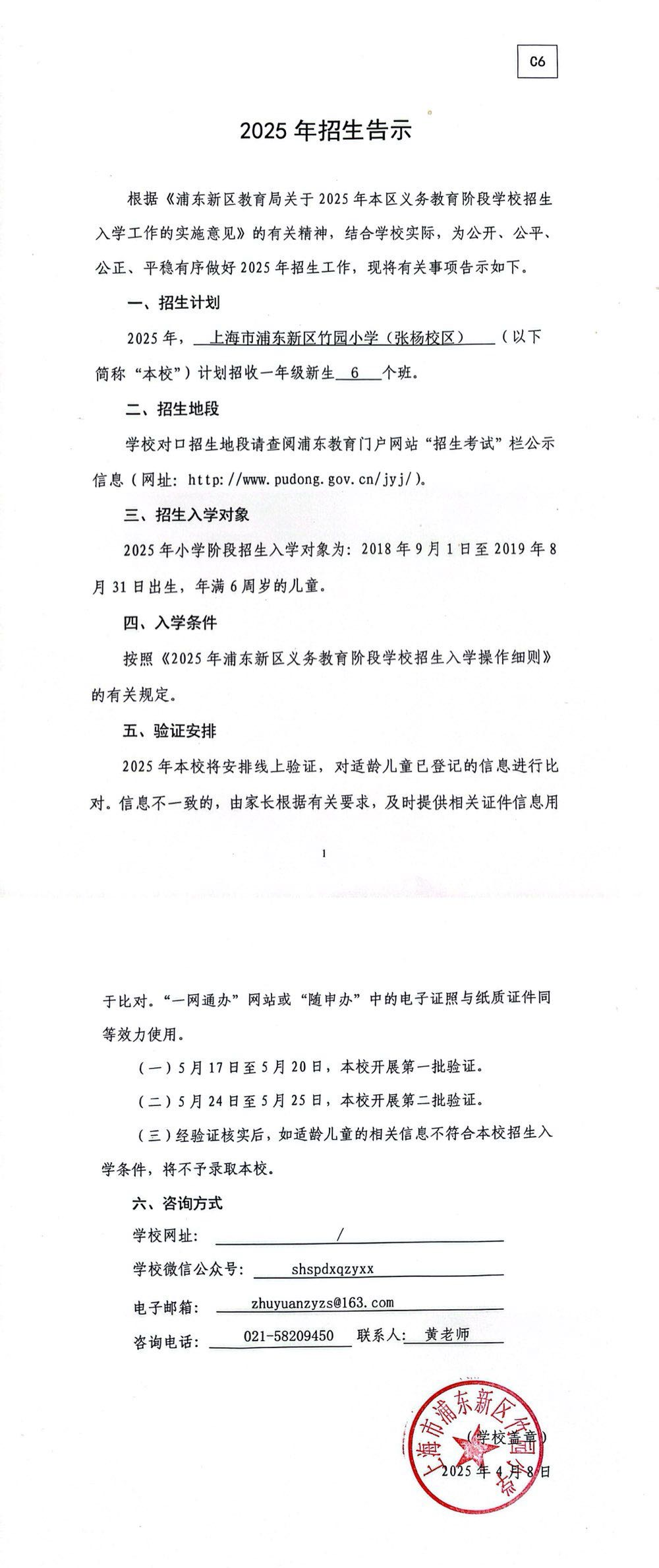 2019年,本校沪东校区计划招收一年级新生6个班。