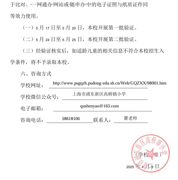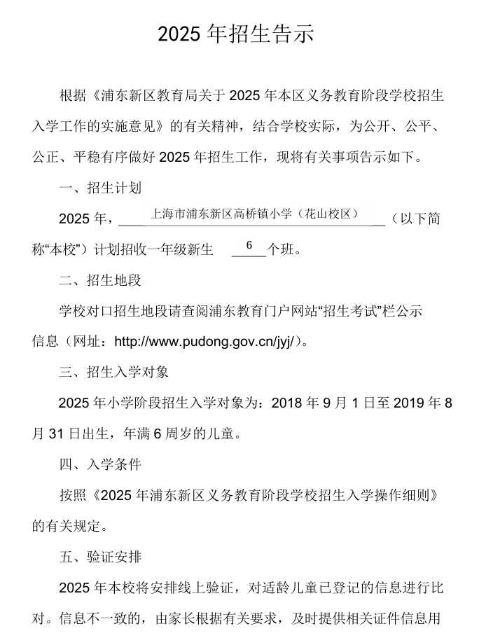 根据《浦东新区教育局关于 2021 年本区义务教育阶段学校招生入学工作的实施意见》有关精神,结合学校实际,为公开、公平、公正、平稳有序做好 2021 年招生工作,现将有关事项告示如下。 招生注意事项 一、招生计划 2021年,上海市浦东新区高桥镇小学(以下简称“本校”)计划招收一年级新生12 个班。 二、招生地段 学校对口招生地段请查阅浦东教育网“招生考试”栏公示信息。 网址:http://www.pudong.gov.cn/jyj/ 三、招生入学对象 2021年小学招生入学对象为:2014年 9月1日-2015年8月31日出生,年满6周岁的儿童。 四、入学条件 按照《浦东新区招生办公室关于2021年本区义务教育阶段学校招生入学的操作细则》的有关规定。 五、验证安排 (一)第一批验证 5月15日—5月16日为本校第一批验证日。家长根据短信通知或“入学报名系统”查询的相关信息,持相关证件(原件)按时来学校进行现场验证。“随申办市民云”中的电子证照与纸质证件可同等效力使用。 (二)第二批验证 5月29日—5月30日为本校第二批验证日。家长根据短信通知或“入学报名系统”查询的相关信息,持相关证件(原件)按时来学校进行现场验证。“随申办市民云”中的电子证照与纸质证件可同等效力使用。 (三)经验证核实后,如适龄儿童的相关信息不符合本校招生入学条件,将不予录取。 六、咨询方式 学校网址:http://www.psgqzh.pudong-edu.sh.cn/ 学校公众号:上海市浦东新区高桥镇小学 电子邮箱:pdxqgqzxx@126.com 咨询电话:58618179 联系人:马佩华 上海市浦东新区高桥镇小学 2021 年 3 月 25 日 - END -