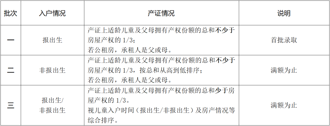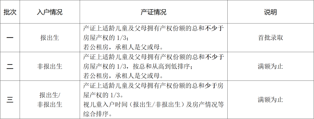 执行上述录取办法后,学校若有剩余名额,对于父母一方入户不满三年的,产证上适龄儿童及父母拥有产权份额的总和不少于房屋产权1/3的,将视入户不满三年者的情况、适龄儿童入户时间(报出生/非报出生)及房产情况等综合排序。持租用居住公房凭证,承租人为父或母的,参照执行。