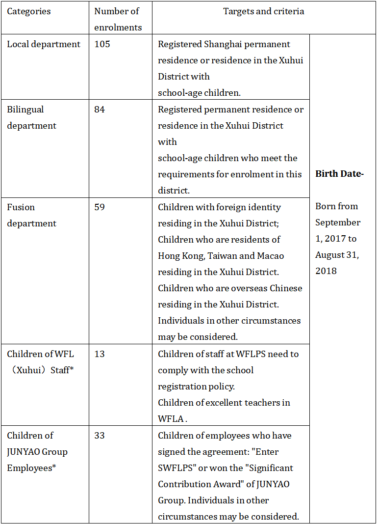 上海市世外小学,原为上海市世界外国语小学,是由均瑶集团举办的民办学校。二十九年来,学校秉承“让学生走向世界,让世界走进学校”的办学理念,邀社会各界人士参与,集教育研究成果之精华,取中外教育经验之长,融中西方文化之优,为每位学生个性化发展打下坚实的基础。学校校区占地面积 22715 平方米, 建筑面积为 14344 平方米, 有室内外运动场地12559 平方米。学校还配有 3D 打印、书法等专用教室 32 间。学校有中外教师 200 人,其中,中学高级职称占 15%,本科学历及以上占 100%。师生比为1:9。学校先后获得“全国五一劳动奖状”、“全国特色学校”、“上海市文明校园”、“上海市行为规范示范校”、“上海市教师发展示范校”等称号。上海市世外小学和中学属于一贯制学校,学校内部有小学直接升入中学的机制。 一、招生计划和对象 (一)招生班级数:2022 年秋季招收一年级十个班。 (二)招生总人数:共 300 名学生。 (三)分类计划和条件: 二、报名办法与时间 6月4日-19日,适龄儿童家长登记孩子入学信息。 6月22日-6月24日,家长在“一网通办网站(义务教育专栏)”或“上海市义务教育入学报名系统” (网址:shrxbm.edu.sh.gov.cn,)上填报志愿。每个儿童填报 1 个参加电脑随机录取志愿和 1 个调剂志愿。(调剂志愿可在徐汇区的民办学校、世外教育集团和学校三个部门间进行选择。) 7月4日-5日,在市教委平台上实施电脑随机录取。 7月10日起,民办学校录取验证并发放录取告知信息。 7月13日-14日,调剂志愿录取。 8月15日,学校开始向新生发放“入学通知书”。 三、收费标准 普通班 23000 元/学期; 双语班 45000 元/学期; 融合班 65000 元/学期。 四、注意事项 请家长仔细阅读招生简章,选择符合条件的类别进行报名。所报志愿凡不符合相关条件的,学校将不予录取。 五、工作纪律 1. 学校承诺:不组织报名或变相报名,不举行任何形式的测试、测评、学科练习、面试、面谈或调查,不收任何学生的简历等材料;招生录取不与 任何教育培训机构挂钩。 2. 义务教育阶段不引进境外课程,不使用境外教材。 六、其他 1. 学校开展网上“校园开放日”活动,家长可登陆学校微信公众号,在“云游世外”栏目中了解更为详尽的信息。 2. 学校地址:桂林西街101弄56号(普通班) 浦北路380号(双语班和融合班) 招生咨询电话:64363556 咨询时间:5月30日-6月3日 9:00-16:00 上海市世界外国语小学 Enrolment Information about WFLPS 2022 Shanghai World Foreign Language Primary School is a private school,administered by the JUNYAO Group. Over the past 29 years, the school has been adhering to the school philosophy of “Let the students embrace the world, let the world be part of school life.” The school invites people from all areas to be educated and while learning from educational research, use this to enhance student learning. We recognize and draw on the advantages of Chinese and global education and integrate the best of Chinese and Western cultures. We believe in laying a solid foundation for the personalized development of each student. The school campus covers an area of 22,715 square meters, with a building area of 14,344 square meters and an indoor and outdoor sports area of 12,559 square meters. The school also has 32 specialist classrooms including 3D printing room, calligraphy room and dedicated art rooms and music areas. There are 200 Chinese and foreign teachers in the school, among which 15 percent hold senior professional titles, 100 percent have aBachelor degree or above. The teacher-student ratio is 1:9. The school has won many awards as "National May Day Labor Award", "National Featured school", "Shanghai Civilized Unit", "Shanghai Model School of Code of conduct" and "Shanghai Model School of Teacher Development". Shanghai World Foreign Language Middle School and Primary School belong to National 9-year Chinese school system. The primary students will go to the middle school under certain policies after their graduation. I. Enrolment plan and targets 1. Number of enrolled classes: 10 classes of Grade One will be enrolled in the autumn of 2022. 2. Total number of enrolments: 300 students. 3. Categories and Criteria Ⅱ. Registration dates and times June 4 - June19: Parents are to fill out the registration form for the school-age children . June 22 - June 24: Parents log on to the website of “All-in-one Office”(zwdt.sh.gov.cn)(Compulsory Education Column) or the Shanghai Compulsory Education Enrolment System (shrxbm.edu.sh.gov.cn) to fill in the preferred school. Each child fills in 1 random admission choice and 1 dispensing choice. (The dispensations can be selected among the three departments of our school or certain schools belong to WFL Education Group or private schools in Xuhui District.) July 4-5: The Municipal Education Commission’s unified platform will generate a random selection via a computer program. From July 10:Private school admission verification and admission information will be distributed to the parents. July13-14: Dispensed choice admission information will be distributed to the August 15: Admission letters will be started to issue to new students. Ⅲ. Charging standard The tuition of 2022: Local department-RMB23000 per semester; Bilingual department-RMB45000 per semester; Fusion department-RMB65000per semester. Ⅳ. Matters to be addressed: Parents must please choose carefully the correct category according to the admission brochures. If the applicant does not meet the requirements outlined, the school reserves the right to refuse admission to the program. Ⅴ. Work Promise: 1. The school promises that students will not be registered in advance and all registrations will be transpa