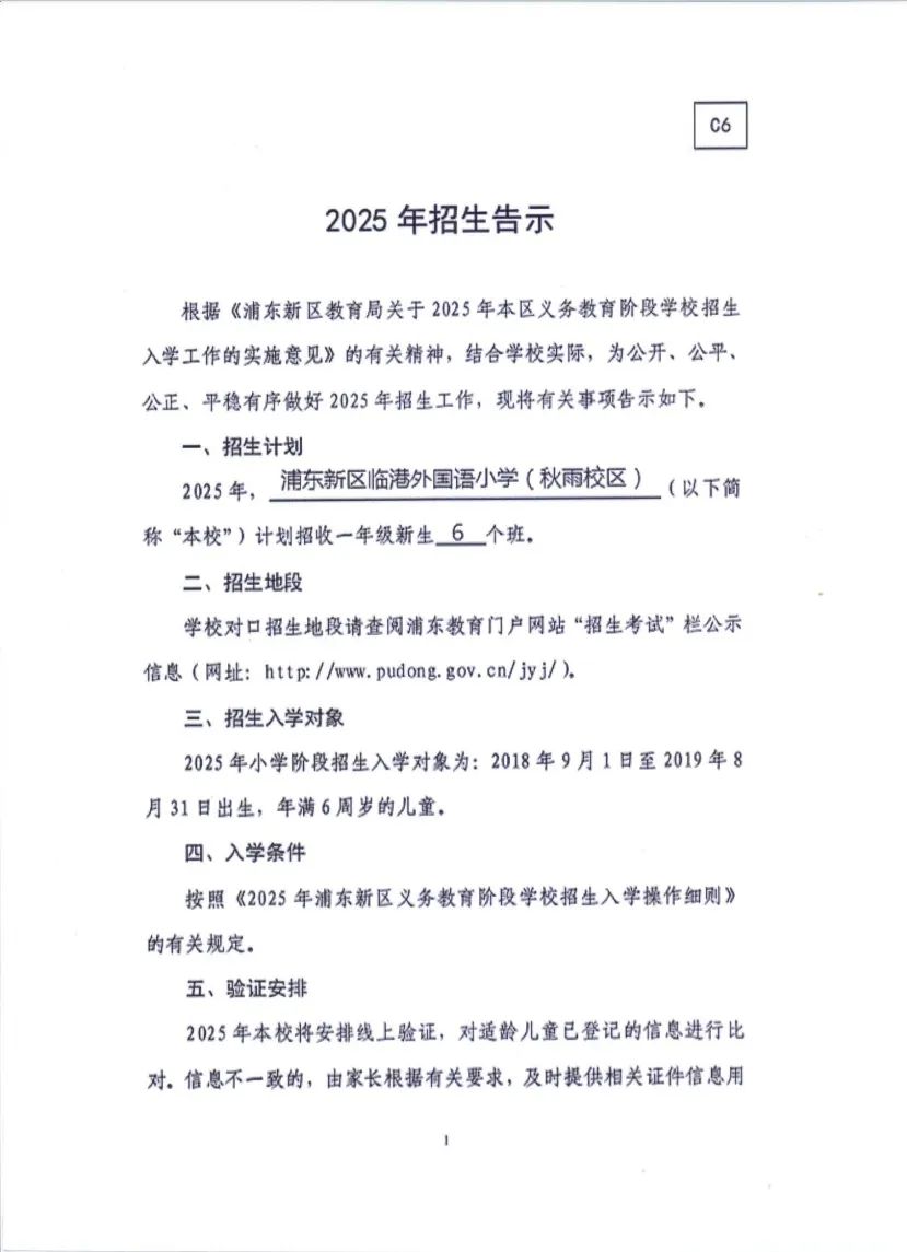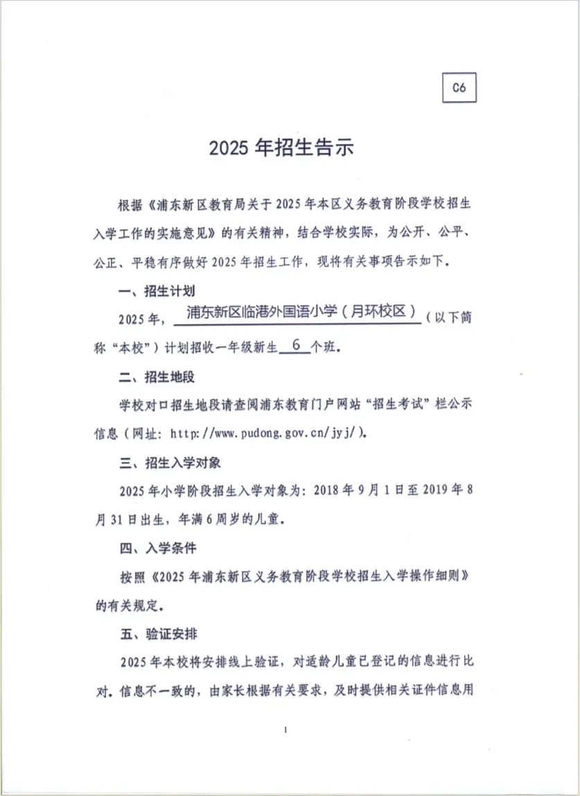 2021 年,临港外国语小学(以下简称“本校”)计划招收一年级新生6个班。