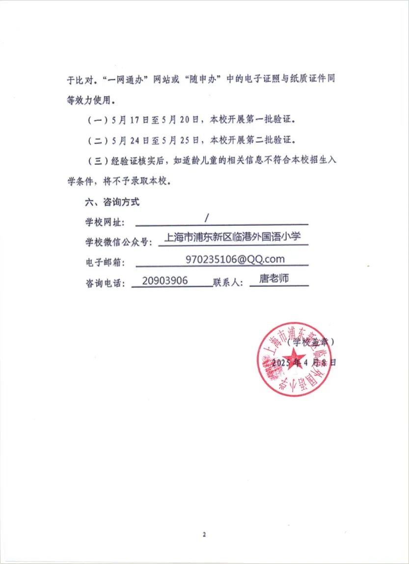 5 月 29 日—5 月 30 日为本校第二批验证日。家长根据短信通知或“入学报名系统”查询的相关信息,持相关证件(原件)按时来学校进行现场验证。“随申办市民云”中的电子证照与纸质证件可同等效力使用。