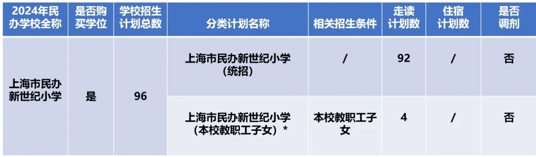 ① 分设计划一,上海市民办新世纪小学(举办方投资的其他民办学校的教职工子女),计划数1名。条件:学校举办方上海东展教育发展有限公司举办的其他中小幼学校在职教职工子女。