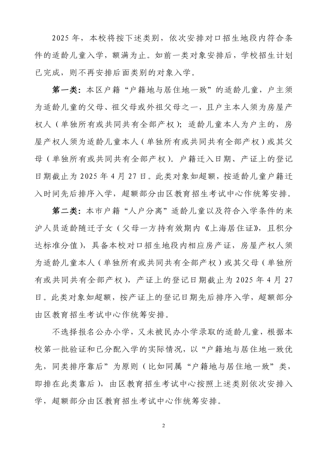 第二类:本市户籍“人户分离”适龄儿童以及符合入学条件的来沪人员适龄随迁子女(父母一方持有效期内《上海居住证》,且积分达标准分值),具备本校对口招生地段内相应房产证,房屋产权人须为适龄儿童本人(单独所有或共同共有全部产权)或其父母(单独所有或共同共有全部产权),产证上的登记日期截至为2021年4月23日。此类对象如超额,按产证上的登记日期先后排序入学,超额部分由招办作统筹安排。