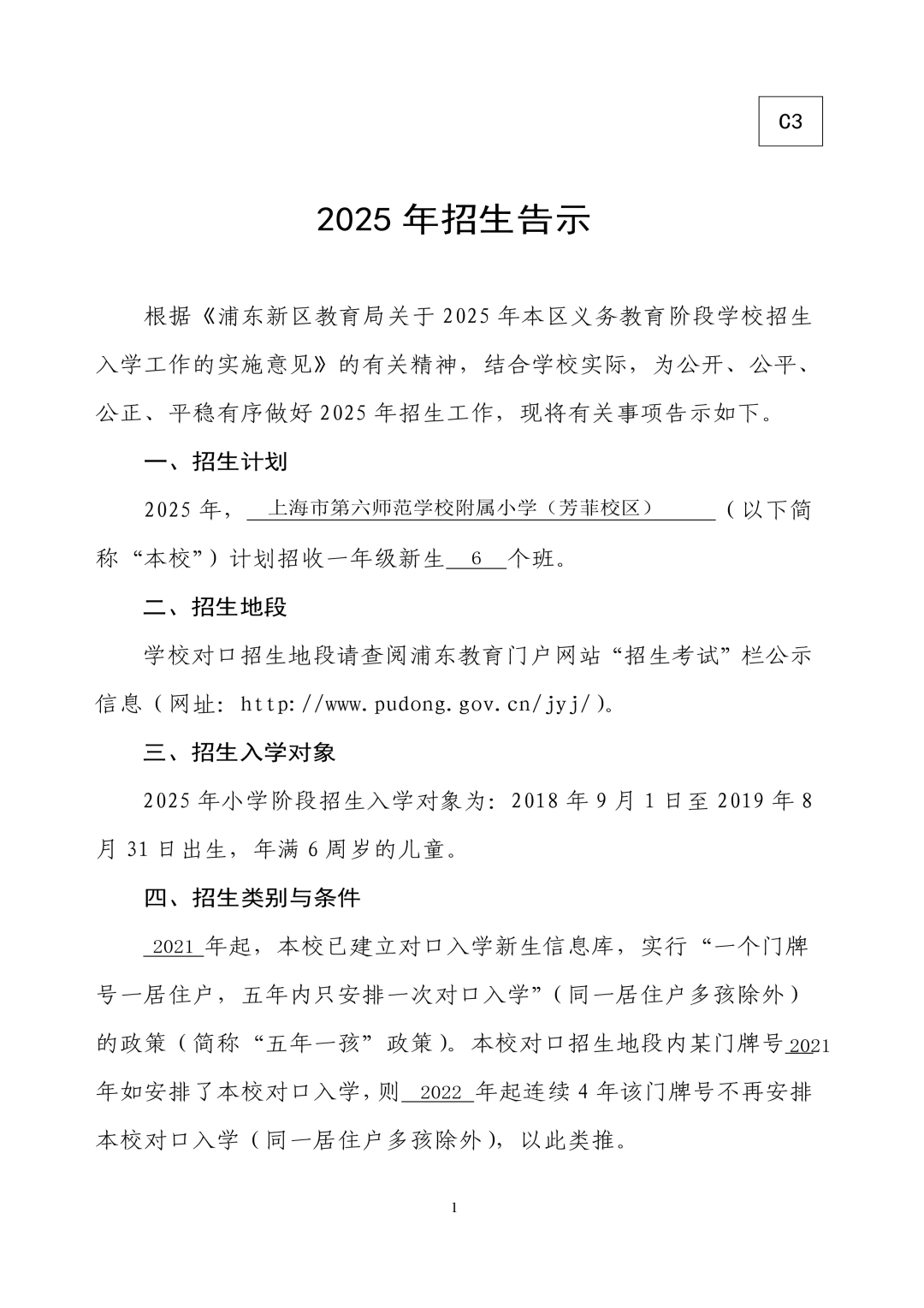 2021年,上海市第六师范附属小学(芳菲校区) (以下简称“本校”)计划招收一年级新生 6个班。