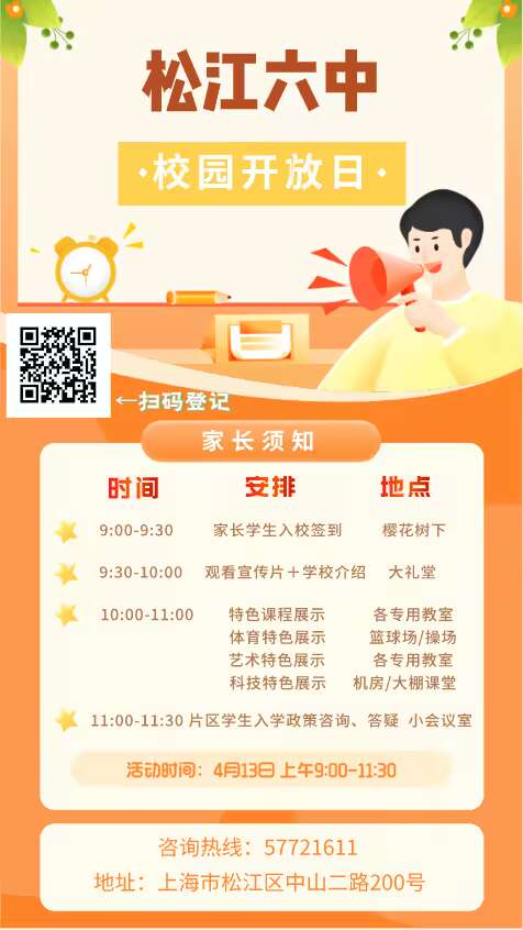 了解我们更多,请关注学校网站校园开放日专栏:http://www.jtez.sjedu.cn/xykfr,或者扫描下方二维码: