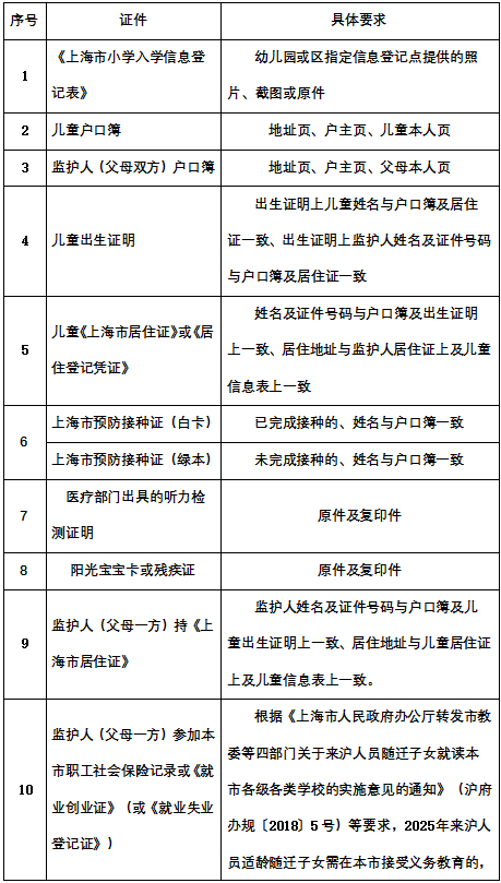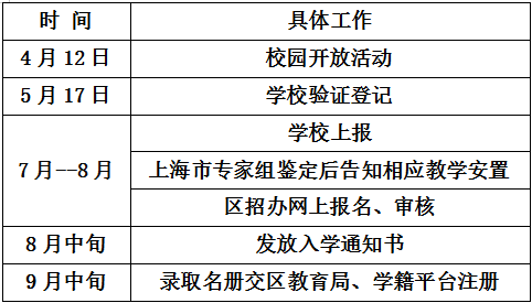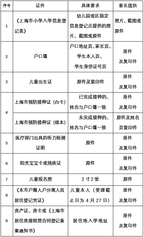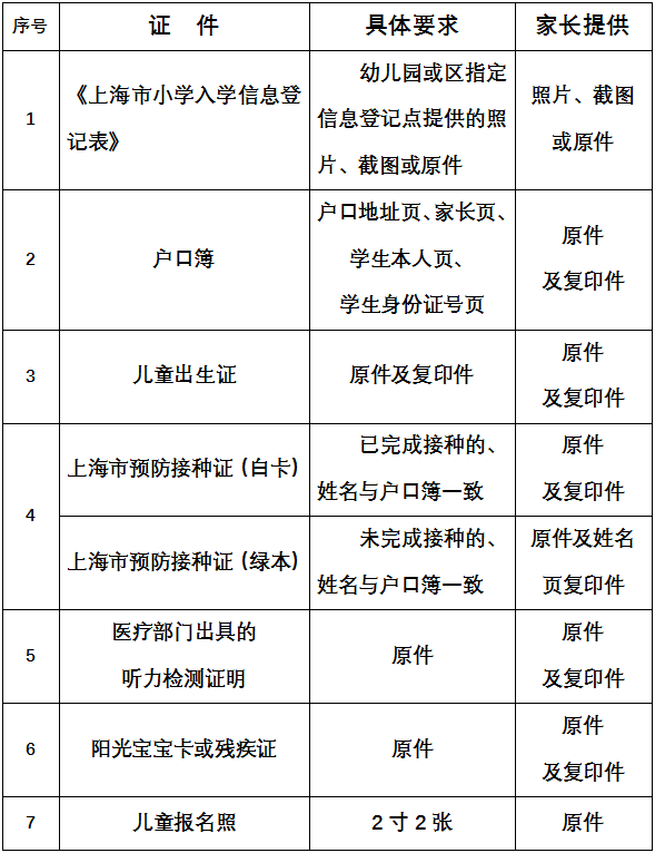 4.发放入学告知。5月20日起,通过短信和“上海市义务教育入学报名系统”陆续告知相关入学信息。民办学校招生工作于5月27日完成,学校将录取名单上报区教育行政部门。学生按学校通知携带户口簿、父母一方有效的《上海市居住证》《就业失业登记证》、参加本市职工社会保险证明、《本市户籍人户分离人员居住登记(回执)》等证件办理入学手续。