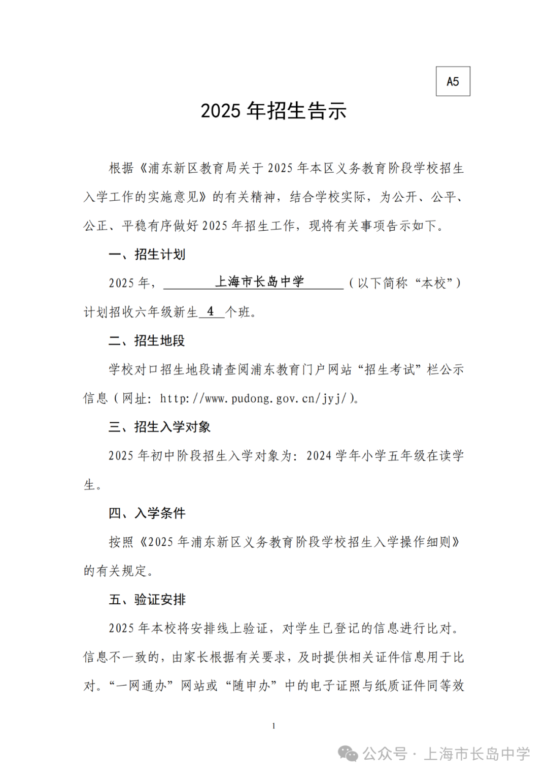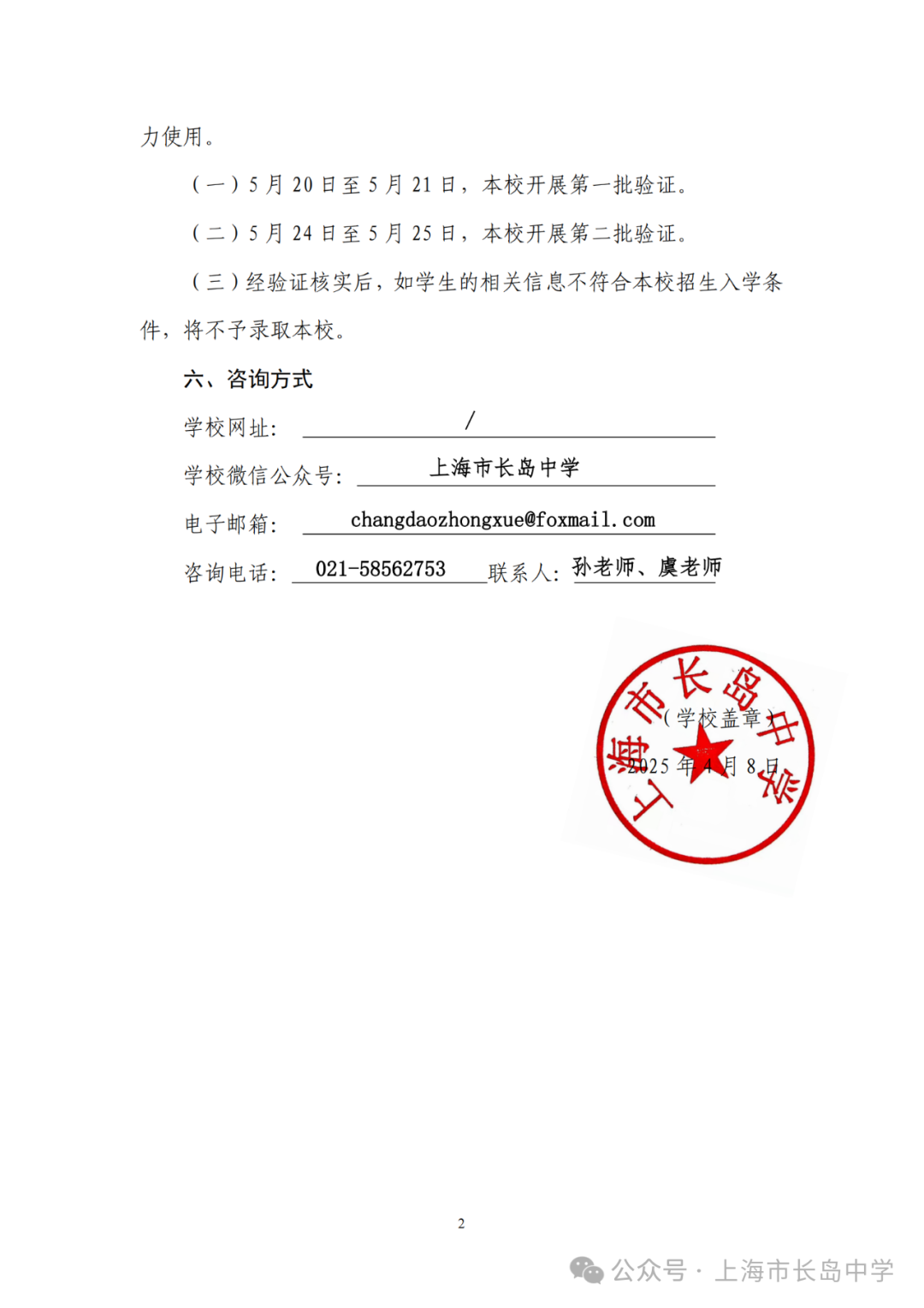 有贵校招生地段内的房产证,但无户口本,这种情况,孩子能到贵校初中部读书吗? 答:可以,属于人户分离性质,只要提供我校招生地段内的有效房产信息,经所在毕业小学、上级教育主管部门录入审核,即可到我校初中部学习。 07 贵校何时开展验证工作? 答:教育主管部门通过小学,给小学应届毕业生发放 《初中入学告知书》,可以根据《入学告知书》的说明到我校进行验证工作。 08 何时到贵校报到? 答:我校将根据浦东新区教育局统一安排,通知2020年预备年级新生到校报到的时间。 09 在外省市就读小学,能到贵校就读初中吗? 答:家长可以到浦东新区招生办进行咨询。 10 贵校属于实行“五年安排一次同校对口入学”政策的学校? 答:我校不属于实行“五年安排一次同校对口入学”政策的学校。 温馨提醒: 疫情防控期间,我校将根据家长咨询的问题,以问答的形式,分几次在长岛中学微信公众号进行解答,敬请关注。 解答的解释权归上海市长岛中学。 电话集中咨询:58562753 咨询时段:3月31日 、4月1日 上午 9:00~11:30、下午13:30~16:00