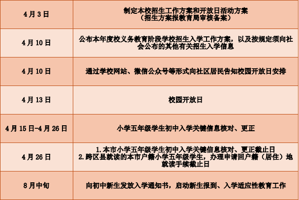 根据《中华人民共和国义务教育法》、《中共上海市委 上海市人民政府关于贯彻<中共中央 国务院关于深化教育教学改革全面提高义务教育质量的意见>的实施意见》、《上海市未成年人保护条例》、《上海市政府信息公开规定》以及《上海市教育委员会关于2020年本市义务教育阶段学校招生入学工作的实施意见》、《2020年普陀区义务教育阶段学校招生入学工作实施意见》等精神,现制定华东师范大学第四附属中学初中部部六年级新生入学工作实施办法如下: 一、指导思想 以国家和上海市的有关法律法规为依据,以“办普陀人民满意的教育”为宗旨,以推进义务教育优质均衡发展,办家门口好学校为目标,以切实维护青少年的合法入学权益,规范办学招生行为为原则,依法实施义务教育阶段招生入学工作。 二、基本原则 1、坚持“依法招生”原则,规范办学行为,依法实施义务教育阶段招生入学工作。 2、坚持义务教育阶段公办学校招生“免试就近入学”。 3、坚持推进义务教育均衡优质发展,办家门口的好学校,满足每一位适龄儿童的入学需求,切实维护青少年儿童的合法权益。 4、坚持公开、公平、公正原则,及时向社会公布义务教育阶段学校招生入学的相关信息,加强与市区教育上级部门、家庭、社会之间的相互沟通,主动接受社会监督。 三、入学条件 对口小学:华师大附属小学五年级毕业生 四、招生办法 1、3月13日(周五),制定本校2020年初中部入学招生方案、网上校园开放日方案;并提交区教育局审核。 2、3月21日(周六)10:00,经教育局批准,通过校园网、微信公众号、校外橱窗、对口小学和对口户籍所在小区宣传栏等处,统一公布告知学校初中招生方案、网上“校园开放日”等信息。 3、因为疫情防控的需要,3月21日(周六)——3月27日(周五),学校举行网上“校园开放日”,家长可登陆华师大四附中学校官网 http://www.hsdsfz.pte.sh.cn/index.htm或关注“华东师范大学第四附属中学微信公众号”,了解学校办学理念、课程设置、师资水平、办学特色等,并可在线参与互动留言。网上校园开放日活动期间安排专人在线回复相关问题咨询与了解。 4、公办初中实行学籍、户籍对口招生,家长无需递送学生材料至初中学校。 1)4月2日(周四)—13日(周一),小学五年级学生家长上网对“上海市义务教育入学报名系统”中的户籍地址、居住地地址等入学关键信息进行核对,并填写监护人手机号码(作为接收初中入学信息的联系方式)。如发现有关信息与实际情况不符的,家长应及时凭有效证件到学生就读小学进行更正。 2)4月13日(周一)为本市小学五年级学生初中入学关键信息核对、更正截止日;跨区就读的本市户籍小学五年级学生办理申请回户籍(居住)地就读手续的截止日。 其中,跨区就读小学但户籍(居住)地在本区的五年级学生,应在就读学校参加小学毕业考试,毕业后可根据实际情况申请回本区就读初中。如需回户籍(居住)地入学的学生,应向就读小学提出申请,由学校告知审核证件、网上申请、统筹安排等事项,家长在网上填报《本市户籍学生回户籍(居住)地就读申请表》,经审核符合条件的,由户籍(居住)地区教育行政部门统筹安排进入公办初中学校就读。 在外省(自治区、直辖市)就读小学但户籍(居住)地在本区的五年级学生,如需在本区就读初中六年级的,须携带相关证件到户籍或居住所在地区教育局指定点办理入学信息登记手续,截止日期为2020年8月10日(周一)。 区教育局结合本地区实际,制定“人户分离”适龄儿童入学实施细则,先安排户籍地与实际居住地一致的适龄儿童就近入学,再在区域内统筹安排“人户分离”适龄儿童入学。 未被民办初中录取的学生,由小学就读区教育局安排进入初中就读;已填报《本市户籍学生回户籍(居住)地就读申请表》,按照填表时所选择的户籍(居住)地,由区教育局统筹安排进入公办初中就读。 5、8月10日(周一),全市公办初中受理就近入学学生办理入学手续截止日;受理随迁子女办理入学手续截止日。 6、8月15日(周六)前,本校向初中新生发放入学通知书。 7、8月23、24日(周日、周一),初中新生报到,家长见证平行分班。 8、8月27、28日(周四、周五),初中新生入学适应教育。 五、工作要求 1、认真学习相关法律法规以及《上海市人民政府办公厅转发市教委等四部门关于来沪人员随迁子女就读本市各级各类学校实施意见的通知》、《上海市教育委员会关于2020年本市义务教育阶段学校招生入学工作的实施意见》、《普陀区教育局关于2020年本区义务教育阶段学校招生入学工作的实施意见》等文件精神,明确招生工作的重要性和意义,了解招生工作的相关政策,制定本校的招生入学实施方案并按规定公示。 2、建立2020年华四招生工作领导小组,制定本校招生工作方案,重视并有效组织招生工作。作为招生工作第一责任人,校长任领导小组组长,副组长为书记、副校长,组员包括课程教学部主任、副主任、校办主任、教务员等。建立以党支部书记为组长、工会、校务委员会、家委会代表组成的招生工作纪律监查委员会,发挥好依法办法规范招生纪律监督作用,确保2020年义务教育阶段招生工作规范有序运作。 3、进一步规范义务教育招生入学工作管理,强化服务意识,继续规范使用“上海市义务教育入学报名系统”做好六年级新生入学信息登记