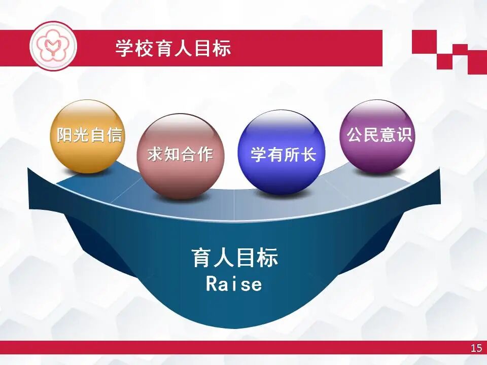 育人目标:阳光自信,求知合作,学有所长、公民意识。重视用课程浸润丰富学生的内心世界,重视不断推进课程革新来引领与提升办学质量,培养学生做一个善于交流合作和仁爱笃行的社会人,做一个勇担责任和质疑求学的智慧人。