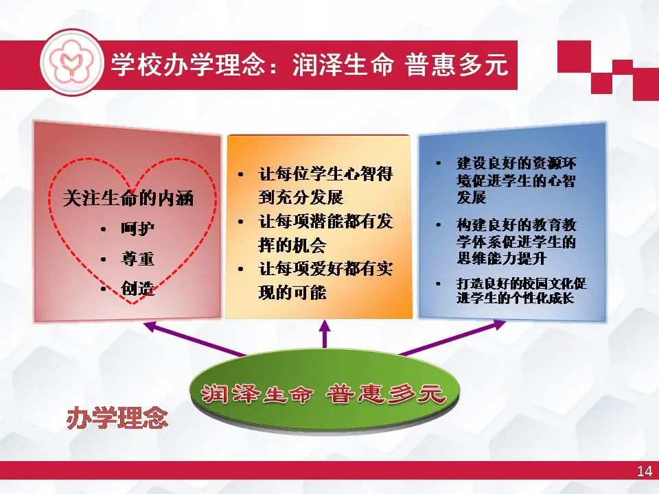 办学理念:润泽生命,普惠多元。基于学生差异化大、师生迫切需要更优质的办学需求,在客观分析学校的办学现状、能力、资源等因素后,学校将办学定位确立为“润泽生命,普惠多元”。润泽意味着用尊重和创造悉心浇灌后每个学生绽放生命的光彩,即把学生作为真实独特的生命个体,把学生放在学校教育的中央,营造良好的教育氛围,促进学生的和谐发展。定位于普惠教育,不是甘于平凡,而是在多元发展中,体现出让每一名学生更好、更充分地发展:让每位学生心智得到充分发展,让每项潜能都有发挥的机会,让每项爱好都有实现的可能,这是梅园育人的使命责任。为此,学校在办学中,致力于建设良好的资源环境促进学生的心智发展,构建良好的教育教学体系促进学生的思维能力提升,打造良好的校园文化促进学生的个性化成长。