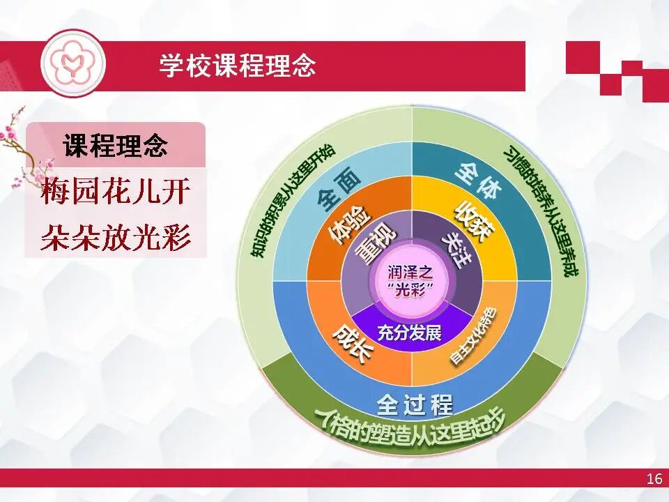 课程理念:梅园花儿开,朵朵放光彩。追求“朵朵放光彩”的格局,就是要让每个孩子都得到尊重、关注和充分发展,在每个领域中把学生的成长、体验、收获作为学校课程建设的出发点和落脚点,课程发展的根基在鲜明的自主文化特色里,努力实现全面、全体、全过程的育人追求。