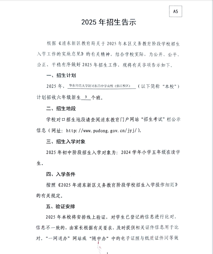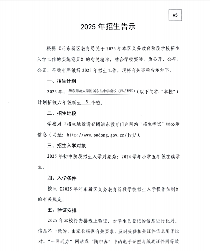 两校区同时招生,按户籍、居住地段等信息对口安排入学,优先安排户籍地与实际居住地(具备相应的房产证)一致的学生对口入学浦东教育网“招生考试”栏(网址:http://www.pudong.gov.cn/jyj/)我校严格按照《2022年浦东新区义务教育阶段学校招生入学工作日程安排》开展招生工作1、不组织报名或变相报名,不举行任何形式的测试、测评、面试、面谈或调查,不收取任何学生的简历等材料;招生录取不与任何教育培训机构挂钩。2、均衡分班,不开设重点班、快慢班、特色班、实验班。