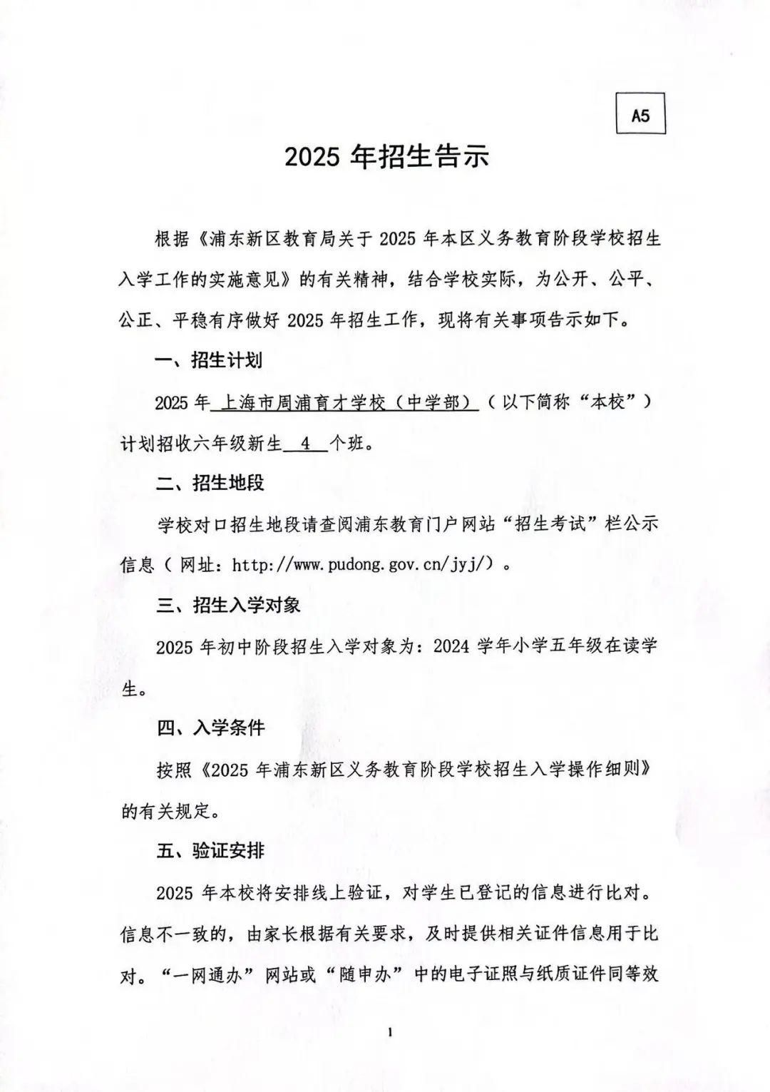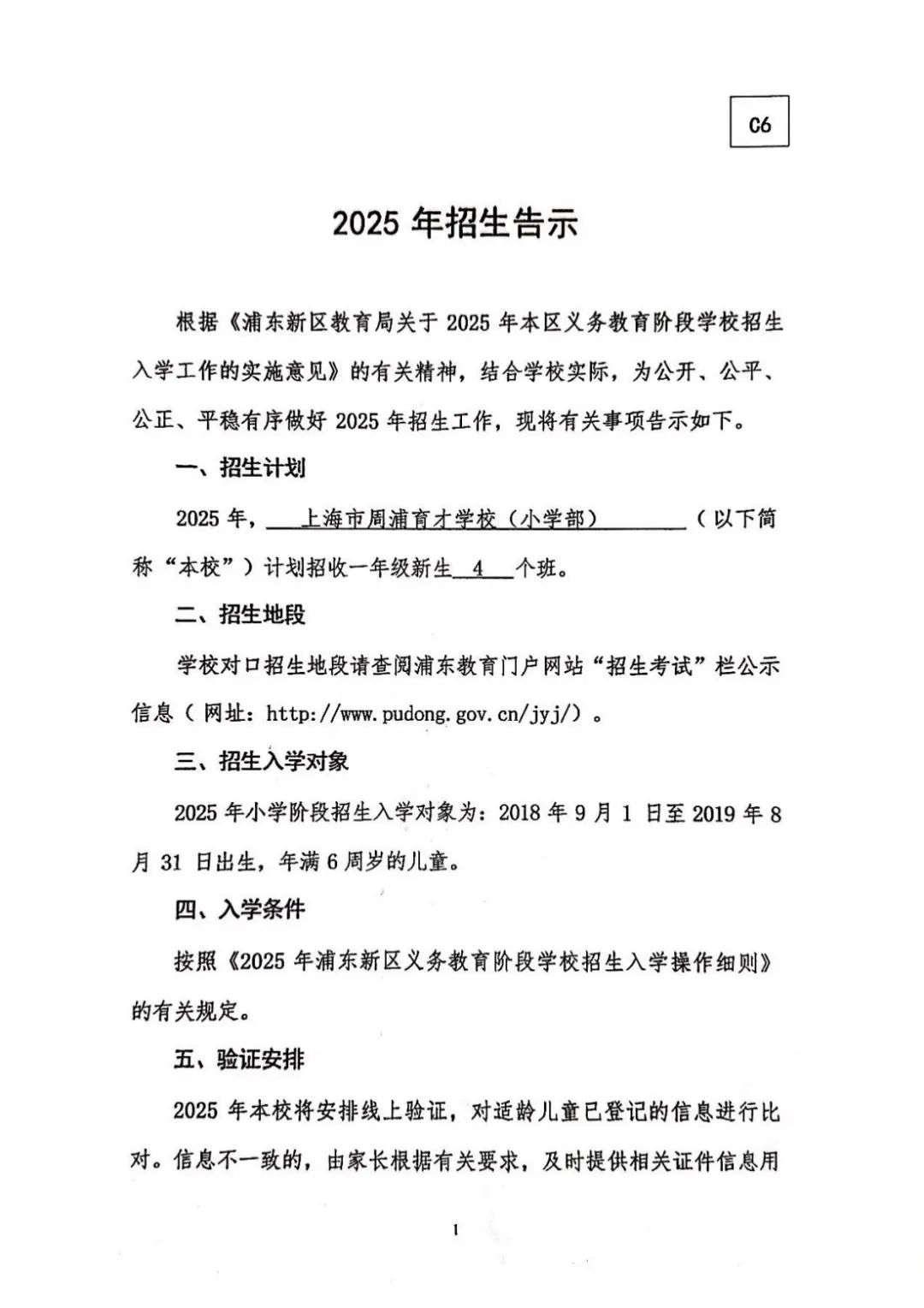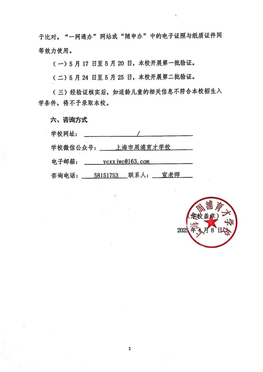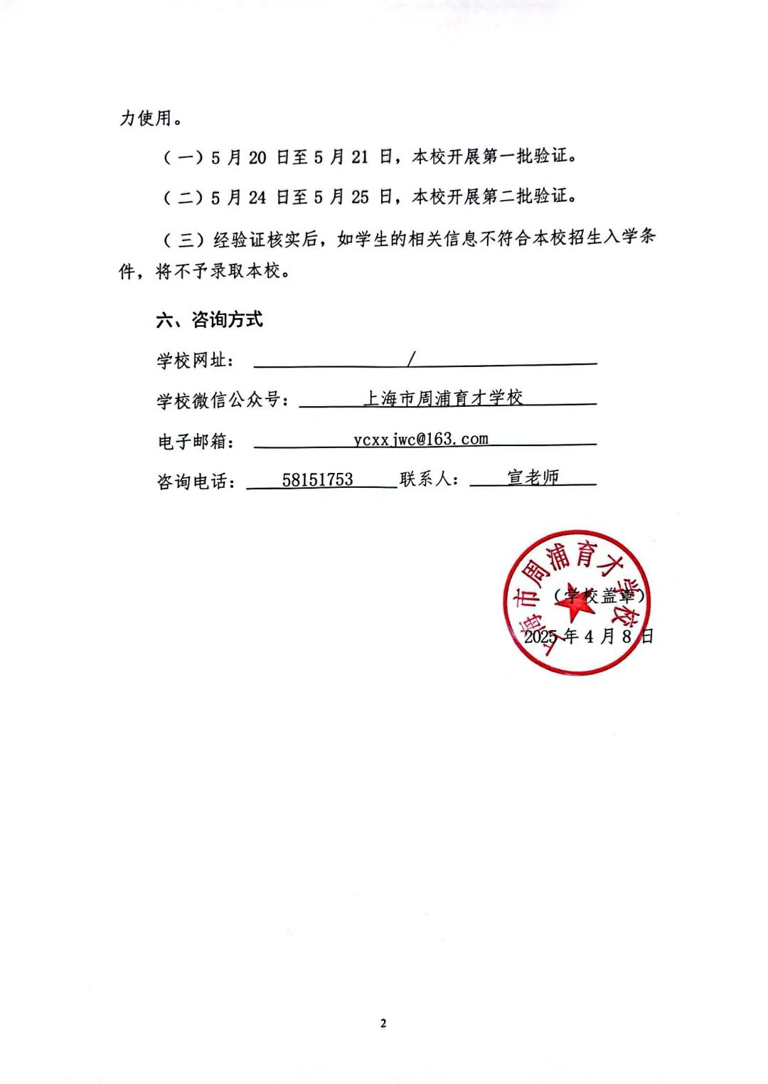 招生信息 因为有你 所以精彩 2023年上海市周浦育才学校招生告示如下,请仔细阅读,注意时间截点: 招生人数 一年级新生 4 个班,共计160人 六年级新生 4 个班,共计160人 招生地段 学校对口招生地段请查阅浦东教育门户网站“招生考试”栏公示信息 网址:http://www.pudong.gov.cn/jyj/ 招生入学对象 2016 年 9 月 1 日---2017 年 8月 31 日出生年满 6 周岁的儿童和2022 学年小学五年级在读学生。 验证安排 (一)5 月16 日—5 月19 日,本校开展第一批验证。 (二)5 月25 日—5 月26 日,本校开展第二批验证。 (三)经验证核实后,如适龄儿童的相关信息不符合本校招生入学条件,将不予录取本校。 学校承诺 1、均衡分班,不开设重点班、快慢班、特色班、实验班。 2、不组织报名或变相报名,不举行任何形式的测试、测评、面试、面谈或调查,不收任何学生的简历等材料。 3、招生录取不与任何教育培训机构挂钩。 咨询方式 学校公众号:上海市周浦育才学校 电子邮箱:ycxxjwc@163.com 咨询电话:58151753 联系人:宣惠中