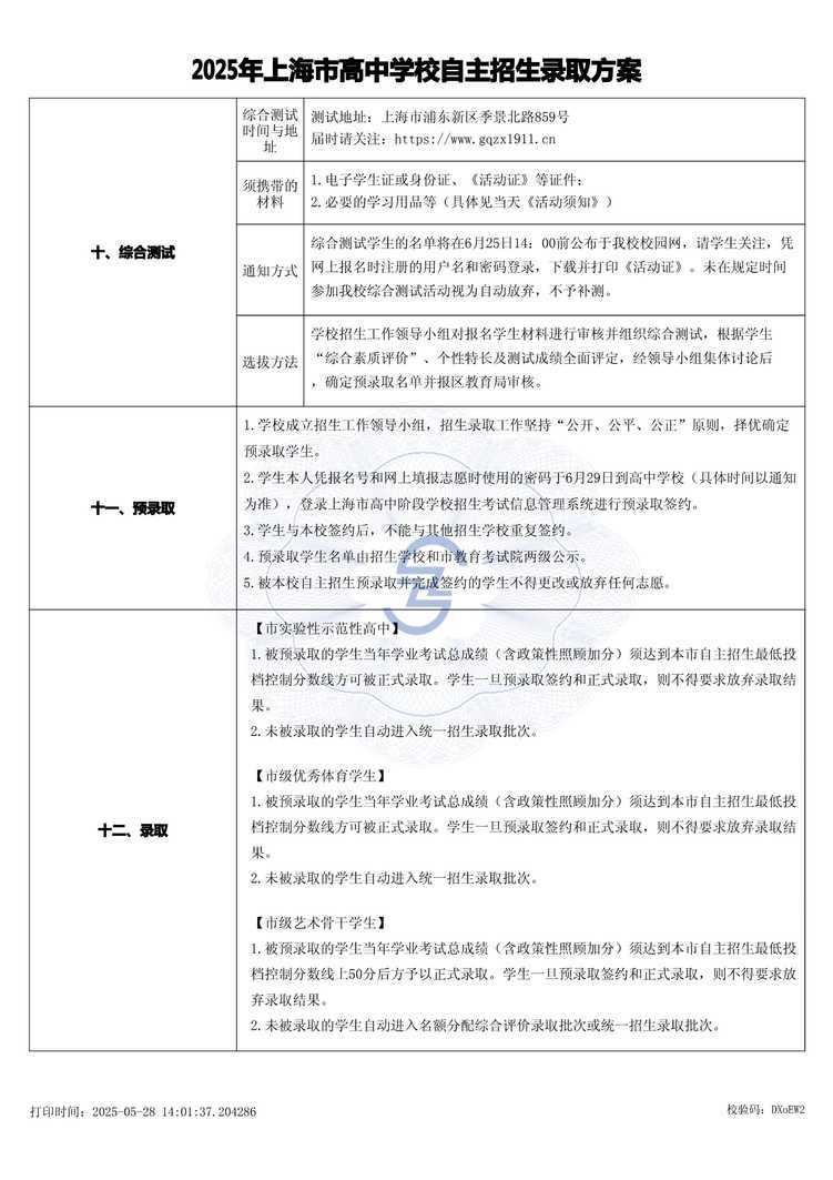 根据《关于做好2021年浦东新区高中阶段学校招收文艺特长生工作的通知》要求,将对报考我校的2021届初中文艺特长生按相关规定进行统一的专业测试。凡符合我校文艺特长生招生条件的学生,经综合考察后,按1:1.2(计划数:文艺特长备取生数)的比例确定文艺特长备取生名单,上报教育局,由浦东新区招办网上公示备取生名单。经公示无异议后,获得“文艺特长备取生”资格的考生,其学业考试成绩须达到上海市高中最低投档控制分数线及以上,在招收学校录取分数线下10分内可送档(不含“零志愿”和“名额分配”招生),区招生办根据各招收学校文艺特长生的招生计划数,从高分到低分录取,同分考生参照《关于2021年浦东新区中等学校高中阶段招生工作的实施意见》中关于同分情况下的处理办法进行。未录取的考生,将恢复原始考分继续参加一至十五志愿投档。