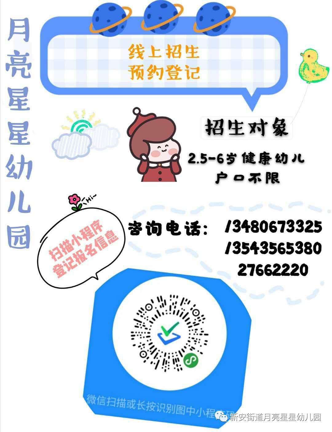 您好! 新冠肺炎疫情防控期间,为了保障大家的安全,我园现全面启动“新生线上报名工作”, 幼儿园暂时不对外开放,不接待家长和孩子入园参观咨询,如您将在春季或秋季学期为孩子选园,有意愿了解月亮星星幼儿园,请扫码下方二维码填写报名表,我们的老师将及时登记孩子的信息,复工开学后第一时间与您取得联系,电话沟通进行确认。