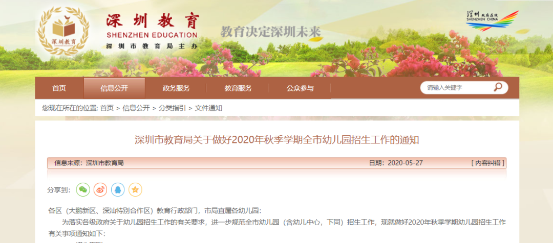 家有萌宝的宝爸宝妈们看过来 深圳市教育局官网发布了 《关于做好2020年秋季学期全市幼儿园招生工作的通知》 2020年秋季学期 全市幼儿园集中招生时间为 6月13日-7月20日 具 体 详 情 幼儿园基本情况 我园原为“深圳东海培萃幼儿园”,创办于2000年9月,属民办全日制”市一级“幼儿园,2020年2月正式转型成为公立幼儿园,更名:”深圳市福田区东海实验小学附属幼儿园“。 1 招生原则 (一)就近招生。面向本园所在社区的适龄儿童招生,小区配套幼儿园优先录取本小区符合条件的适龄儿童。有空余学位的幼儿园,可以向周边社区招生。平时如有缺额,可随时补招。 (二)免试入园。幼儿园招生实行免试入园,除健康检查外,不对幼儿和家长进行任何形式的考试或测查。 (三)公平公正。坚持依法依规按程序招生,完善招生制度,保障招生工作公开、平稳、规范、有序进行。 1 收费标准 保教费: 每月966元/人 伙食费: 每月350元/人(每学期按5个月计算) 幼儿体检: 按实际收费 1 招生对象 2017年8月31日(含8月31日)前出生的儿童,共100名 1 参照公办幼儿园标准以就近入园为原则。 具体招生范围为: 东海国际公寓、福禄居、十八居、天御香山花园、 深南中学住宅小区、东海花园1期、2期、君豪阁 香荔绿洲、雍祥居、深业中城 1 招生程序 1、公布报名日期: 6月6日我园将以幼儿园门口公示栏、微信公众号通知,并提供专人咨询人员及电话咨询服务。 2、报名日期 :6月13 日— 6日26日 家长通过幼儿园报名系统进行网上报名。(不以先到先得为录取条件,请大家在有效时间内错峰报名即可) 3、递交资料日期: 6月27日--6月28日 上午9:00-11:30 下午14:00-16:30 4、资料审核日期: 6 月29日—7月8 日 5、公布录取名单日期: 7月10 日,以短信通知及公众号查询录取结果 报名所需资料 除符合年龄外,报名儿童还需符合如下条件: (一)持有儿童本人居民身份证(通行证或护照等)、出生证明和预防接种证明; (二)持有儿童所在家庭户口簿,其父母(或监护人,下同)至少一方具有深圳户籍或持有具有使用功能的深圳经济特区居住证。报读公办幼儿园的,父母至少一方具有深圳户籍或持有具有使用功能的深圳经济特区居住证,且在深圳居住满1年、连续参加社会保险(养老保险和医疗保险)满1年; (三)儿童所在家庭住址与所申报幼儿园须在同一个社区(或小区),并持有家庭居住证明材料(下列材料中的任一项): 1.由我市不动产登记管理部门出具的本社区(或小区)住宅用途的不动产权证书或有效购房合同; 2.现居住地街道办事处房屋租赁管理部门登记备案的本社区(或小区)住宅用途《房屋租赁凭证》; 3.在住房建设部门登记备案的本社区(或小区)政策性住房的《购房合同》或《租赁合同》; 4.本社区(或小区)其他住房的有效证明材料。对享受优惠政策的烈士、现役军人、消防救援、公安英模和因公伤残或牺牲警察的适龄子女实行教育优待政策,报名时需持有相关政策证明材料。 享受优惠政策的高层次人才适龄子女入园执行深圳市委组织部等15个部门《关于印发<深圳市高层次人才“一站式”服务暂行办法>和<深圳市高层次人才“一站式”服务业务指南>的通知》(深组通〔2013〕105号)等文件相关规定。 1 录取条件说明 我园参考福田区小一学位申请文件 划分生源类别 第一类:父母在学校报名地段购房 *(要求为住宅 用途商品房,家庭合法产权在 51%以上, 下同),儿童入户在该房产。 第二类:父母在学校报名地段购房 *,但儿童未入 户在该房产。 第三类:在学校报名地段有以下特殊房产之一,且 儿童入户在该房产:①商务公寓住房,并有合法证明材料;②父母购买 住宅用途商品房合法产权在 51%以下;③ 祖父母(外祖父母)在学校报名地段购房 且祖孙三代户口均在该房产。 第四类:在学校报名地段有以下特殊房产之一,但 儿童未入户在该房产: ①商务公寓等特殊住房,并有合法证 明材料;②父母购买住宅用途商品房合法 产权在 51%以下。 第五类:儿童为福田户籍,父母在学校报名地段租 房或能提供其他有效住房证明。 第六类:儿童为非福田户籍,父母在学校报名地段 租房或能提供其他有效住房证明。 第七类:儿童不在居住范围内。 先招一类幼儿,名额未满后再进行抽签招收二类儿童,以此类推,额满为止。 1 地址 深圳市福田区香轩路30号 邮编:518040 咨询电话 83189005 谭老师 咨询时间 周一至周五 上午09:30-11:30 下午14:30-17:00 报名入口