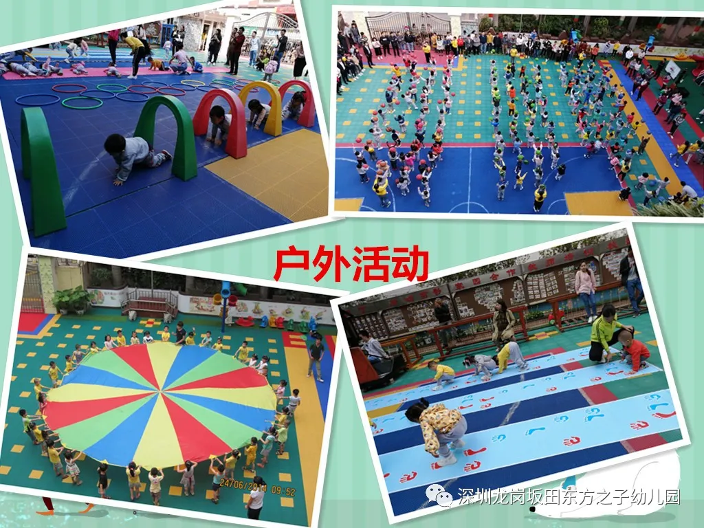 幼儿体能:幼儿每天至少进行2小时户外和室内活动,并进行体能训练和进行定期的体能测试(每学期一次),每年举行一次幼儿运动会活动。