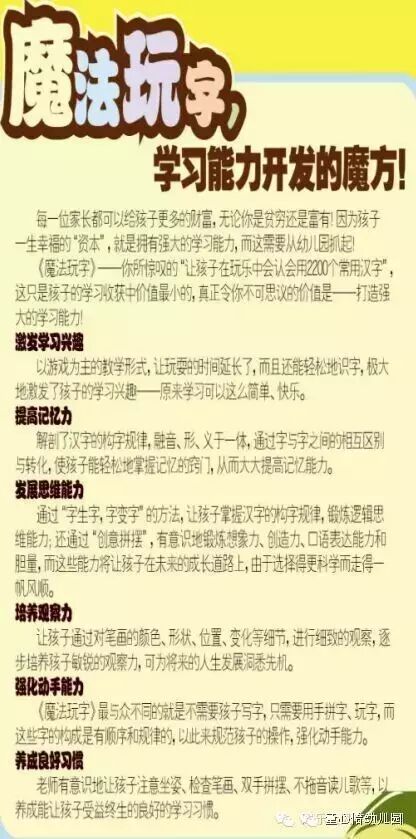 每一位家长都可以给孩子更多的财富,无论你是贫穷还是富有!因为孩子一生幸福的“资本”,就是拥有强大的学习能力,而这需要从幼儿园抓起!