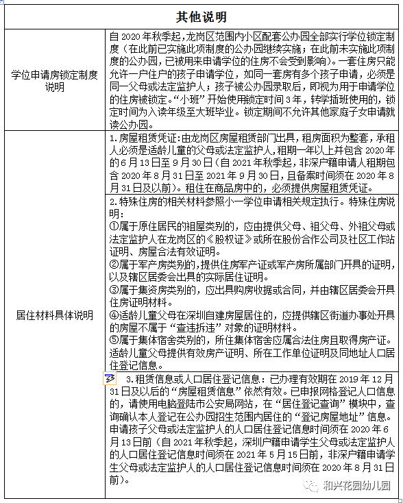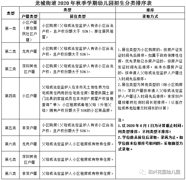 PART.01 1 根据《深圳市龙岗区教育局办公室关于转发<深圳市教育局关于做好2020年秋季学期全市幼儿园招生工作的通知>的通知》(深龙教办〔2020〕3号)相关要求,现就本园2020年秋季学期招生工作安排通知如下: 一 招生人数 二 招生条件 三 招生范围 1、和兴小区的适龄儿童,小区配套幼儿园优先录取本小区符合条件的适龄儿童。有空余学位时向愉园社区招生,愉园社区招生后仍有空余学位,再向街道内其他社区招生。 2、享受政府相关优惠政策人员子女。 四 招生程序 (一)公布招生方案,提供咨询(2020年6月8日) 2020年6月8日,启动招生宣传工作,通过业主群、公众号等途径向小区及社区居民公示招生方案。 (二)填写《新生报名登记表》(2020年6月8日—24日) 1.通过微信公众号等方式推送《新生报名登记表》。 2.现场报名:幼儿园提供纸质版《新生报名登记表》,家长现场填写相关信息,手写签名确认。 (三)提交申请资料,分批验资(2020年6月28日—7月3日) 1.提交时间:2020年6月28日—7月3日 上午9:00—11:30 下午15:00—16:30 2.提交地点:幼儿园招生点 3.家长提交相关申请资料(查原件,收复印件),招生小组工作人员在现场查验资料。 需核验的报名资料如下: 1.户口本; 2.儿童出生证(已办理身份证的需另提交身份证); 3.父母(或监护人)身份证; 4.儿童预防接种证明; 5.住所证明(房产证、房屋租赁合同或其他证明) (1)由我市规划和国土部门出具的住宅用途的深圳房地产权证书或有效购房合同; (2)现居住地街道办事处房屋租赁管理所登记备案的住宅用途《房屋租赁凭证》、《房屋租赁信息》或人口居住登记信息(整套房屋且有效期为一年以上); (3)监护人在住建部门登记备案的政策性住房的《购房合同》或《租赁合同》; (4)其它住房有效证明材料。 6.非深户儿童需提供父母一方有效的深圳市居住证或深户证明; 【深圳居住满1年、连续参加社会保险(养老保险和医疗保险)满1年(2020年因疫情影响,导致的社保断缴、新旧证件有效期暂时无法接续等情况,养老保险和医疗保险从2020年5月31日往前累计均满1年)】 7.港澳户籍适龄儿童除按照非深户籍适龄儿童提供资料外,还需提供香港(澳门)永久性居民身份证、港澳居民来往内地通行证(回乡证)、由公证部门出具的父母与子女间亲属关系公证书(建议在我市、区公证部门办理); 8.属于享受政府特殊优惠政策人员的适龄子女,在申请学位时除应按上述要求提供上述材料外,还应出具优惠政策规定的有关材料。 五 录取办法 根据《龙城街道2020年秋季学期幼儿园招生分类排序表》,和兴小区符合条件的幼儿优先录取,录满为止。 如有空余学位向愉园社区招收符合条件的幼儿,社区内同等条件下优先录取所属社区内无配套幼儿园小区的适龄儿童,从第一类至第八类依次录取,录满为止。 若还有空余学位,再面向龙城街道内其他社区招收符合条件的幼儿,依旧从第一类至第八类依次录取,录满为止。 分类排序详情请查阅下图列表: (二)录取结果通知方式 我园将于7月10日前通过电话或短信方式通知已录取幼儿家长,未接到录取通知的家长请及时到周边其他幼儿园咨询报名工作。 PART.02 1 温馨提示 (一)报名和验证先后顺序与录取结果无关。 (二)儿童父母(或监护人)对报名信息和验证材料的真实性负责,存在验证信息与报名信息不符,或提供虚假材料一经查实的,将视为自动放弃学位。未在规定时间内提交审核验资材料的,也将视为自动放弃学位。 (三)被录取儿童须体检合格后方可正式入园。 (四)收费备案项目及标准: 保教费:1200元/月(根据深发改[2015]26号文件,根据各幼儿园等级确定保教费收费标准) 伙食费:380元/月(根据龙岗区幼儿园伙食费最新收费标准执行) 咨询电话:89912000 89912008 罗老师 刘老师 陈老师 深圳市龙岗区龙城街道 和兴花园幼儿园 2020年6月11日