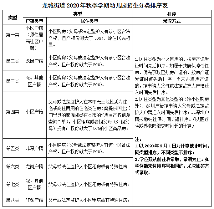 根据《深圳市龙岗区教育局办公室关于转发<深圳市教育局关于做好2020年秋季学期全市幼儿园招生工作的通知>的通知》(深龙教办〔2020〕3号)相关要求,现就本园2020年秋季学期招生工作安排通知如下: 2 0 2 0 幼儿园概况 深圳市龙岗区龙城街道云彩幼儿园创建于2005年9月,是深圳市一级幼儿园、深圳市优质特色示范园创建单位,园所位于龙城街道东方沁园小区内,幼儿园占地面积2869平方米,办学规模9个班,其中小班3个、中班3个、大班3个。 招生名额 2020年秋季招生名额为50人,小班幼儿50人。 招生对象 小班级(3-4岁): 2016年9月1日后(含9月1日)— 2017年8月31日前(含8月31日)出生的儿童。 招生范围 1.优先录取东方沁园小区符合条件的适龄儿童。 2.录取后有空余学位时,向所属愉园社区招生,同等条件下优先录取愉园社区内无配套幼儿园小区的适龄儿童。 3.享受政府相关优惠政策人员子女。 招生程序 1.报名 2020年6月13日-6月26日 公众号扫描二维码下载打印《新生报名登记表》,并按照要求准备资料。 资料准备齐全后请在6月13日——6月26日期间递交到幼儿园门卫室,园内会定期整理,逾期不予受理。 2.园方审核 2020年6月27日-7月2日 园方审核资料,审核通过的幼儿,园方会以电话或短信的方式告知来园现场核验原件。6月27日后不再接受任何方式的报名。 3.审核原件 2020年7月3日-5日 错峰审核资料原件,具体时间会电话通知被录取的幼儿监护人。 4.上级部门审核汇总 2020年7月6日-8日 上级教育部门审核汇总新生的报名资料 5.名单公示 2020年7月10日 成功录取的幼儿,园方会进行名单公示,幼儿园将会以短信或电话的方式通知家长,请家长朋友注意查收,并在填写资料时务必填写准确的手机号码。 6.新生体检 2020年8月5日-15日 新生自行预约就近社康进行入园体检。 请自行扫码获取《新生报名登记表》 招生条件 除符合年龄要求外,报名儿童还需符合如下条件: (一)持有儿童本人的出生证明、儿童预防接种证明。 (二)持有儿童所在家庭户口簿,其父母(或监护人)至少一方具有深圳户籍或持有具有使用功能的深圳经济特区居住证。非深户儿童需提供父母一方连续参加社会保险满1年的证明,养老保险和医疗保险从2020年5月31日往前累计均满1年) (三)儿童所在家庭住址与所申报幼儿园须在同一个社区(或小区),并持有家庭居住房屋证明材料(下列材料中的任一项): 1.由我市规划和国土部门出具的住宅用途的深圳房地产权证书或有效购房合同; 2.现居住地街道办事处房屋租赁管理所登记备案的住宅用途《房屋租赁凭证》、《房屋租赁信息》或人口居住登记信息(整套房屋且有效期为一年以上); 3.监护人在住建部门登记备案的政策性住房的《购房合同》或《租赁合同》; 4.其它住房有效证明材料。 ★对享受优惠政策的烈士、现役军人、消防救援、公安英模和因公牺牲伤残警察的适龄子女实行教育优待政策,报名时需持有相关政策证明材料。 ★享受优惠政策的高层次人才适龄子女入园执行深圳市委组织部等15个部门《关于印发<深圳市高层次人才“一站式”服务暂行办法>和<深圳市高层次人才“一站式”服务业务指南>的通知》(深组通〔2013〕105号)等文件相关规定。 ★港澳户籍适龄儿童除按照非深户籍适龄儿童提供资料外,还需提供香港(澳门)永久性居民身份证、港澳居民来往内地通行证(回乡证)、由公证部门出具的父母与子女间亲属关系公证书(建议在我市、区公证部门办理) 报名资料 1.附件《新生报名登记表》 2.儿童出生证明 3.儿童预防接种证复印件、幼儿预防接种查验证明 4.户口薄复印件 (户口本需复印首页、监护人页及幼儿页) 5.父母身份证(复印在同一页) 6.房产信息复印件 7.非深户需提供父母的有效居住证和连续一年的参保证明。 温馨提示 (一)报名和验证先后顺序与录取结果无关。 (二)儿童父母(或监护人)对报名信息和验证材料的真实性负责,存在验证信息与报名信息不符,或提供虚假材料一经查实的,将视为无效报名,录取后也将取消学位。 (三)被录取儿童须体检合格后方可正式入园。 (四)在深圳市预防接种信息系统中建有档案的儿童,家长可直接登录深圳市疾病预防控制中心(www.szcdc.net)或深圳市免疫规划之窗(www.spepi.net),输入幼儿姓名及免疫卡号在网上打印“幼儿预防接种查验证明”。 咨询电话:0755-33602323 庄老师 东方沁园(云彩)幼儿园 2020年6月5日