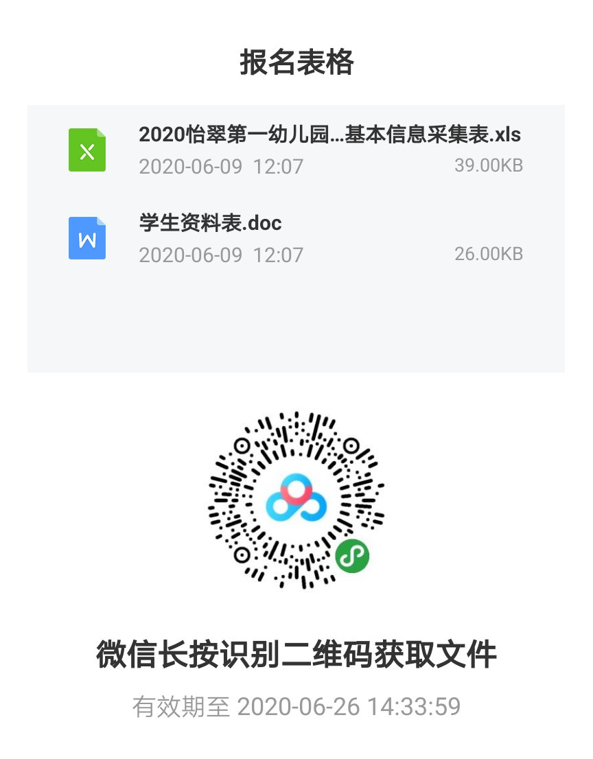 本次招生工作先实行预报名信息登记,请家长扫描下方二维码下载怡翠第一幼儿园在园儿童基本信息采集表或者来园保安处领取表格,并完整、真实的填写幼儿报名信息,并于6月26日之前把已填好的儿童基本信息采集表交回幼儿园的保安处,并做好交表登记。