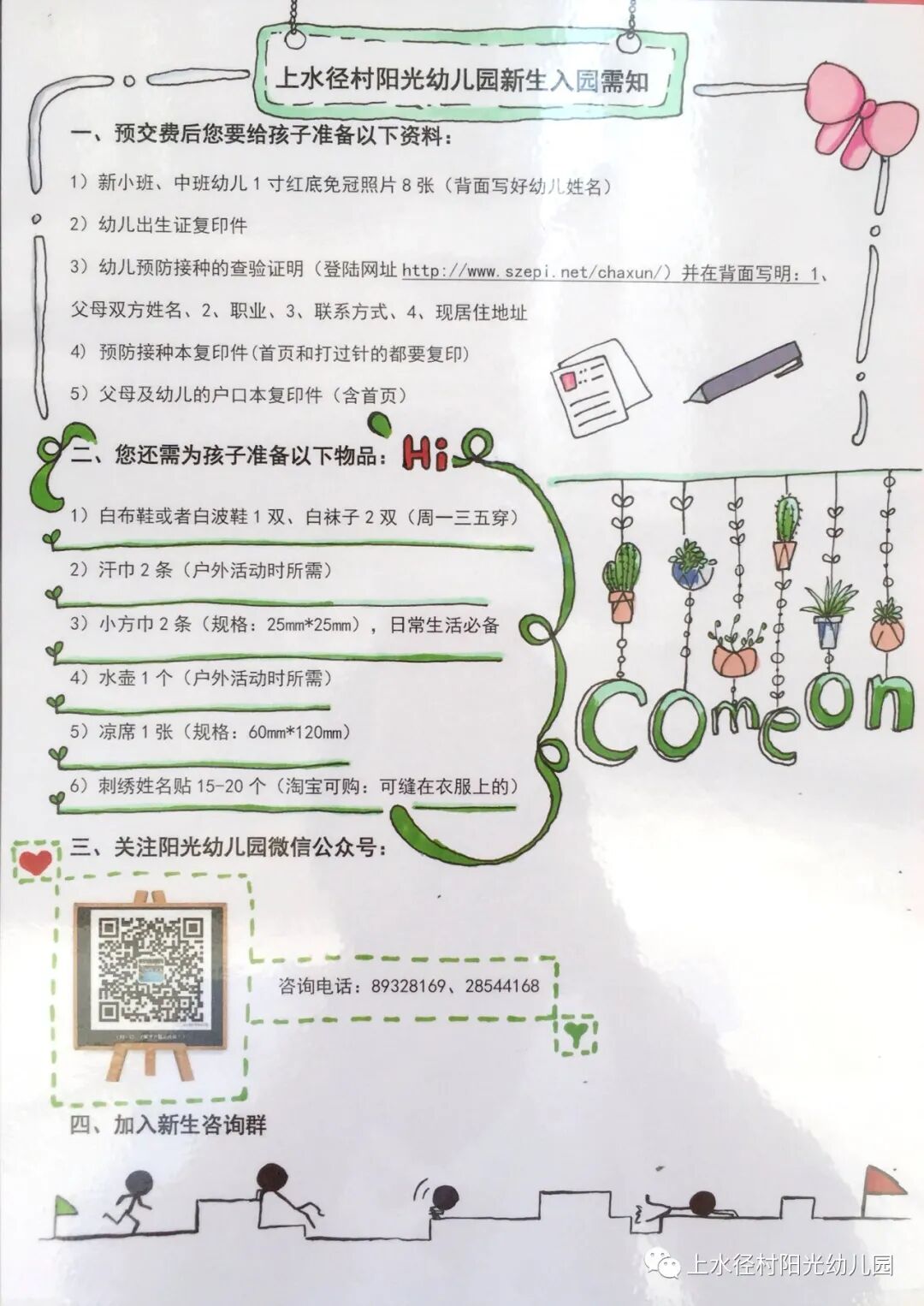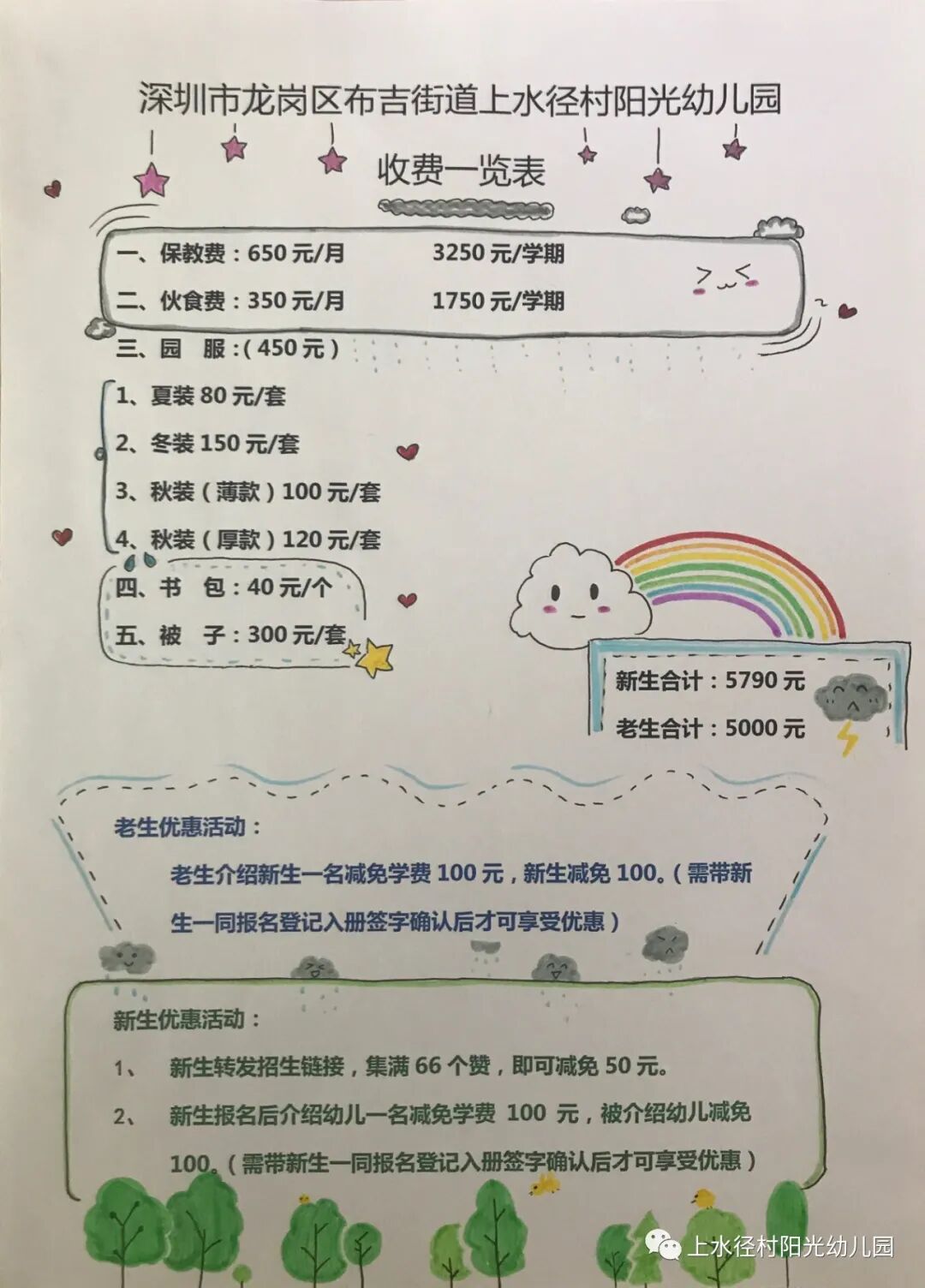 — 上水径村阳光幼儿园 — 招 生 & 公 告 根据《深圳市教育局关于做好2020年秋季学期全市幼儿园招生工作的通知》(深教〔2020〕81号)和《深圳市教育局关于做好2020年秋季学期直属幼儿园招生工作的通知》相关要求,本园2020年秋季学期招生工作安排如下: 上水径村阳光幼儿园 ★2020年秋季收费项目及标准★ 【快乐中秋】 【消防演练】 【欢度国庆】 【防食物中毒演练】 【反恐防爆演练】 【家长开放日活动】 【秋游活动】 【集体生日会活动】 【亲子运动会】
