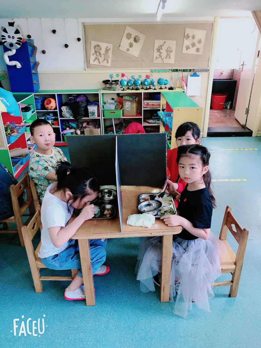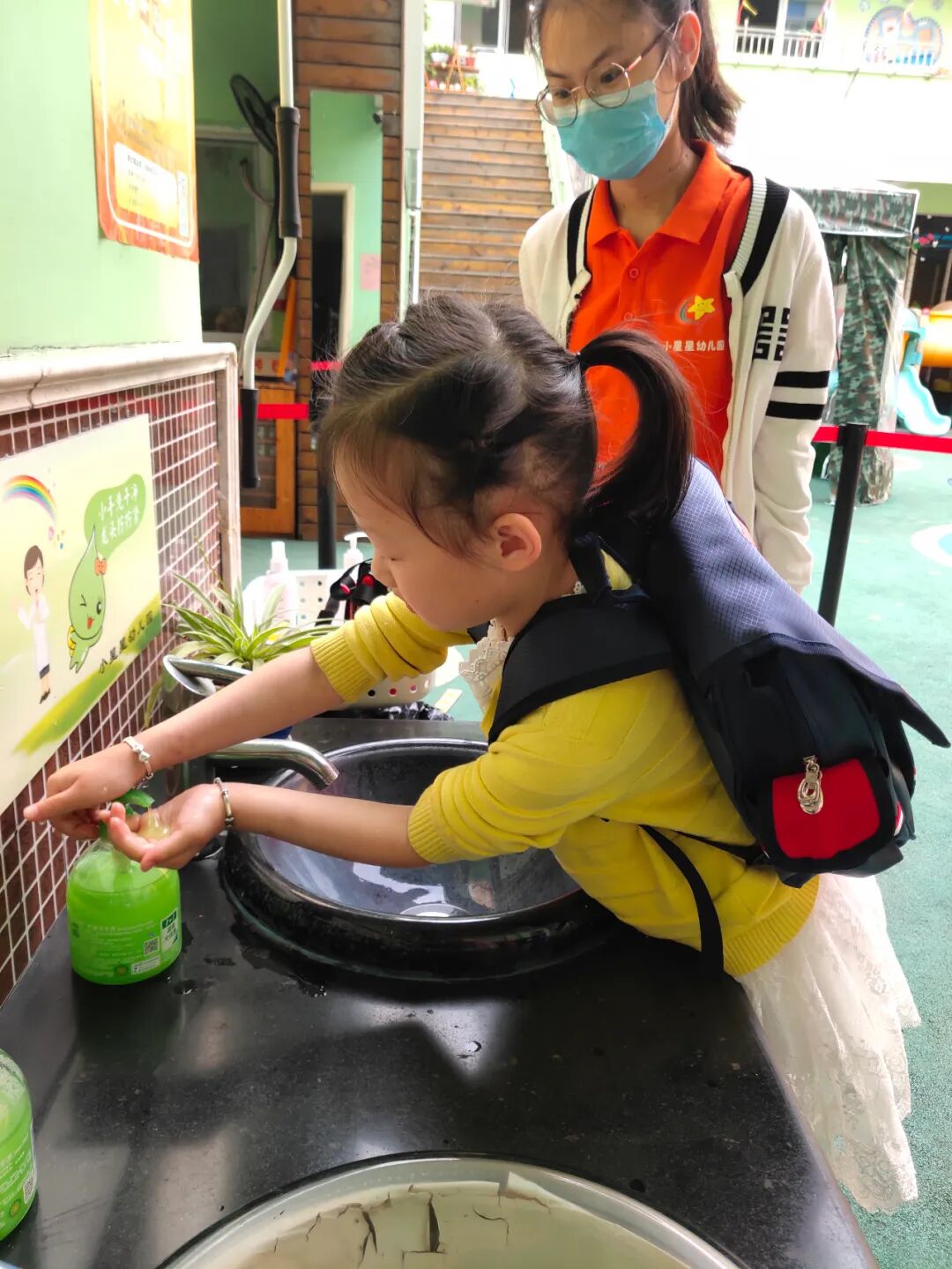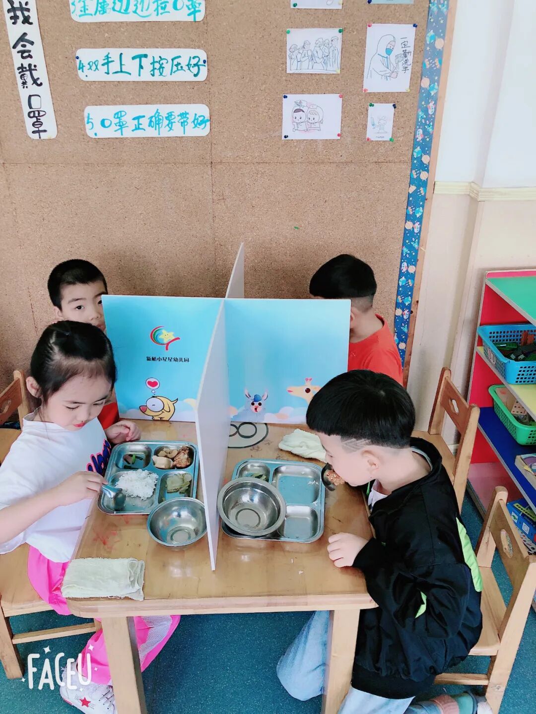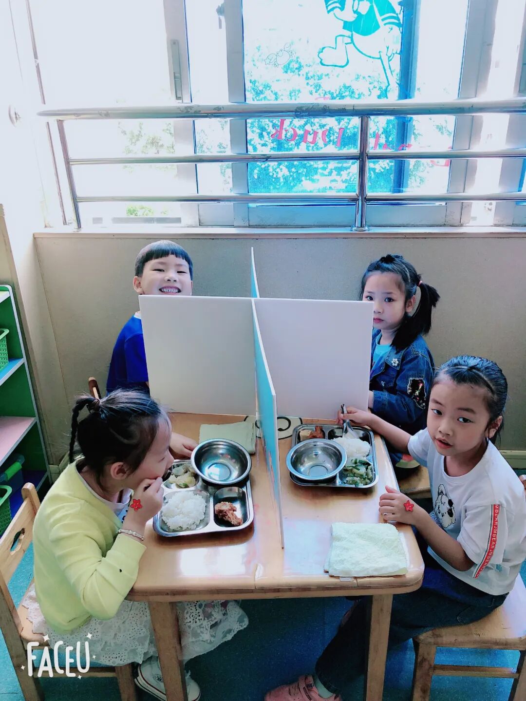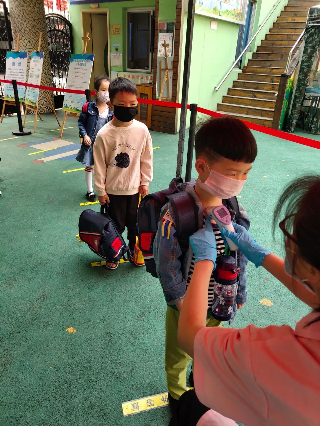 入园篇——遇见温暖遇见爱 清晨,幼儿园全体教职工就立马进入备战状态:检查场地布置、准备测温消杀器材、安保值班及防疫各点人员到岗等,为幼儿安心入园保驾护航。 为了保障孩子们的健康安全,每个进入校园的宝宝都必须戴口罩、间隔一米。早上8点的幼儿园门前,小朋友们和爸爸妈妈挥手告别,通过校门口的脚底消毒、洗手、测温、晨检等环节独自有序入园。 孩子们按着七步洗手法,瞧,他们洗的多认真! 小手洗干净 一米距离等待晨检 保健老师对每一个孩子进行测体温、手部和喉咙进行检查,发现异常立即请家长就医。 学习篇——遇见最美的你 花开“疫”散,快乐归来。开学第一课,卫生防疫知识不可少,老师们带着孩子一起认识新型冠状病毒,了解七步洗手法,学习规范戴口罩等,提高幼儿的自我保护能力和健康安全知识。 学习正确的洗手 老师教我们正确戴口罩 戴口罩方法:拉开口罩,我们很快就可以区分口罩的正面和反面,找到口罩的金属条表示在上面、戴上口罩后,记得按压鼻梁上的金属条,最后检查口罩是否已经戴好,是否已经盖住鼻子和嘴巴了! 小朋友学得好认真呀!!你,学会了吗? 开学第一课,老师们通过绘本故事、儿歌、游戏等形式开展开学第一课,对幼儿进行生命教育、心理健康教育、爱国主义教育。 好新奇的用餐模式, 午餐时间 隔着隔板吃饭 虽然看不到好朋友 但吃饭照样香喷喷 长大一岁的我 争做不挑食乖宝宝 O(∩_∩)O 午休前 班级老师会给每个孩子测体温 全日关注孩子的健康状况 睡前测体温 嘘,我们安静午休咯!!! 一天的时间过得真快,转眼就要了离园时刻。宝贝们井然有序的在指定地点排队,遵守规则,为你们点赞哦! 宝贝们全部离园后,保育员开始对班级进行消毒打扫,迎接明天宝宝的到来! 清洁 消毒 特殊时期的开学 虽然来的有点晚 就让我们带着对新学期的希望 期待所有的美好和成长 在老师与家长的共同呵护下 和宝贝们一起度过这段特殊时期 令成长不再延期