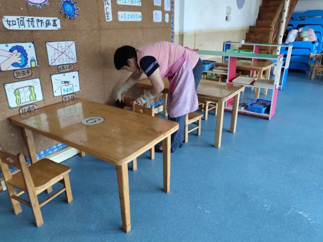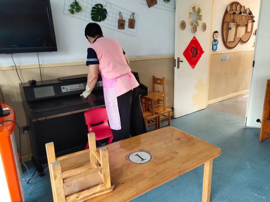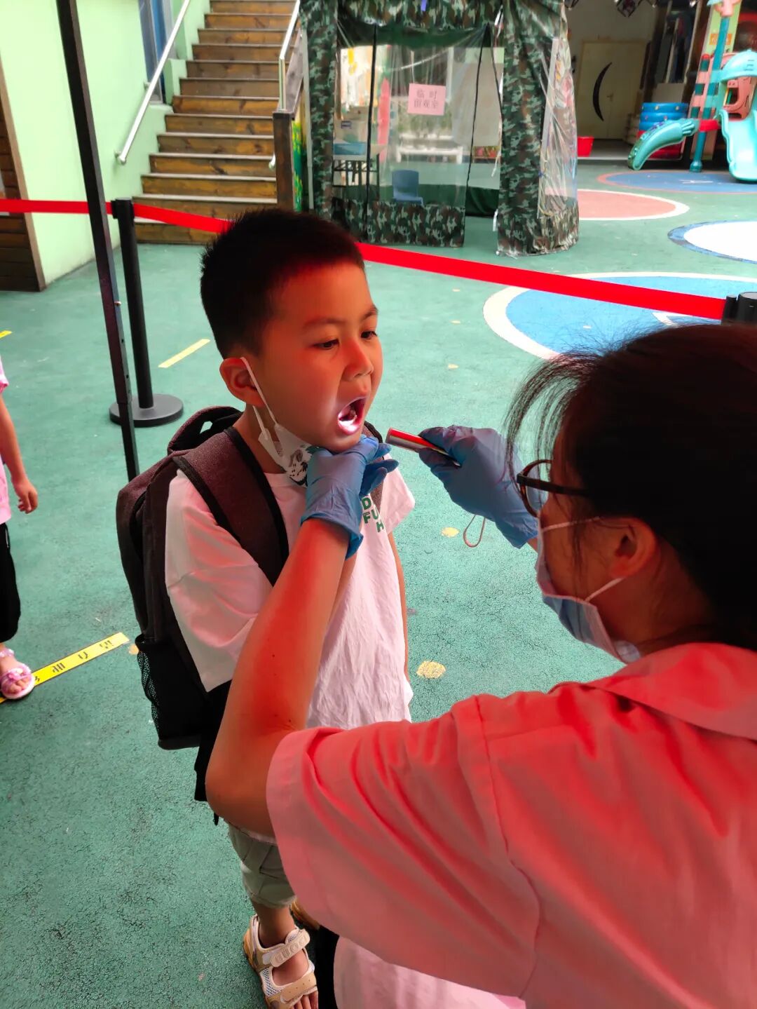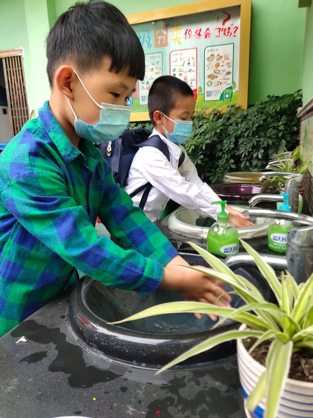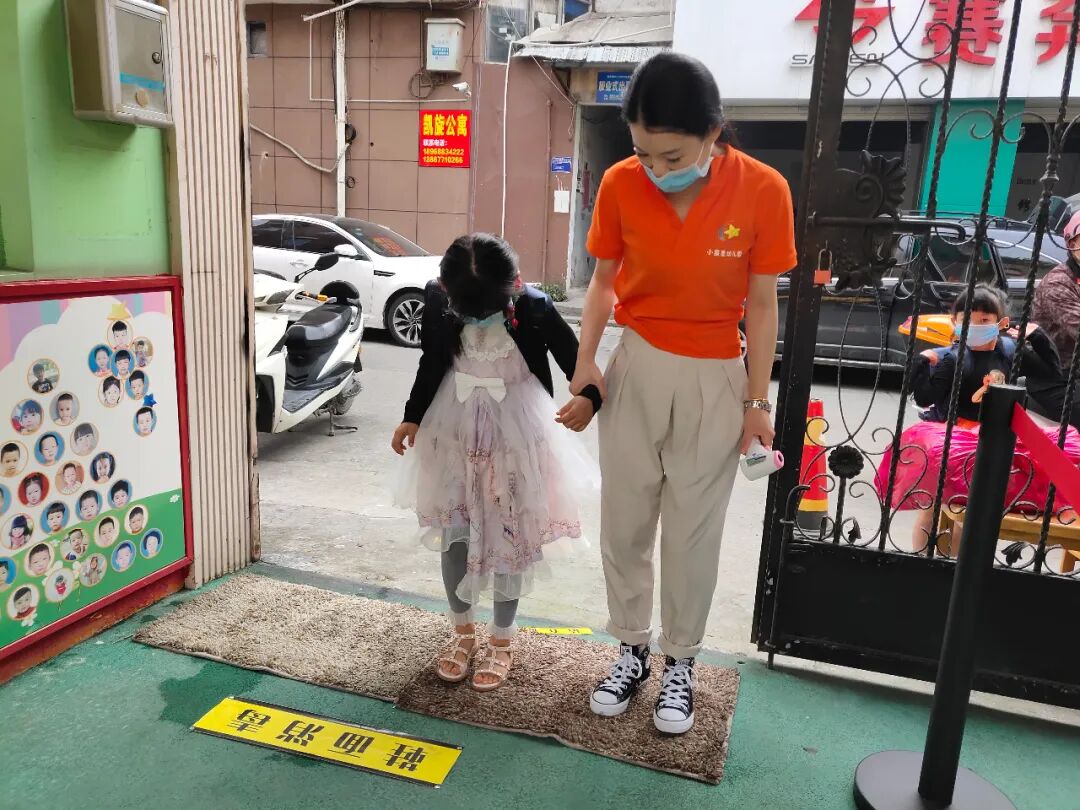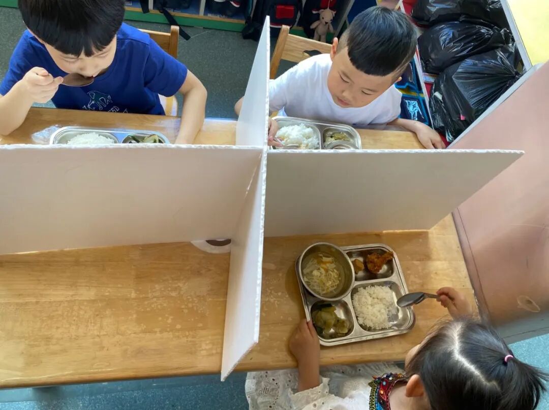 入园篇——遇见温暖遇见爱 清晨,幼儿园全体教职工就立马进入备战状态:检查场地布置、准备测温消杀器材、安保值班及防疫各点人员到岗等,为幼儿安心入园保驾护航。 为了保障孩子们的健康安全,每个进入校园的宝宝都必须戴口罩、间隔一米。早上8点的幼儿园门前,小朋友们和爸爸妈妈挥手告别,通过校门口的脚底消毒、洗手、测温、晨检等环节独自有序入园。 孩子们按着七步洗手法,瞧,他们洗的多认真! 小手洗干净 一米距离等待晨检 保健老师对每一个孩子进行测体温、手部和喉咙进行检查,发现异常立即请家长就医。 学习篇——遇见最美的你 花开“疫”散,快乐归来。开学第一课,卫生防疫知识不可少,老师们带着孩子一起认识新型冠状病毒,了解七步洗手法,学习规范戴口罩等,提高幼儿的自我保护能力和健康安全知识。 学习正确的洗手 老师教我们正确戴口罩 戴口罩方法:拉开口罩,我们很快就可以区分口罩的正面和反面,找到口罩的金属条表示在上面、戴上口罩后,记得按压鼻梁上的金属条,最后检查口罩是否已经戴好,是否已经盖住鼻子和嘴巴了! 小朋友学得好认真呀!!你,学会了吗? 开学第一课,老师们通过绘本故事、儿歌、游戏等形式开展开学第一课,对幼儿进行生命教育、心理健康教育、爱国主义教育。 好新奇的用餐模式, 午餐时间 隔着隔板吃饭 虽然看不到好朋友 但吃饭照样香喷喷 长大一岁的我 争做不挑食乖宝宝 O(∩_∩)O 午休前 班级老师会给每个孩子测体温 全日关注孩子的健康状况 睡前测体温 嘘,我们安静午休咯!!! 一天的时间过得真快,转眼就要了离园时刻。宝贝们井然有序的在指定地点排队,遵守规则,为你们点赞哦! 宝贝们全部离园后,保育员开始对班级进行消毒打扫,迎接明天宝宝的到来! 清洁 消毒 特殊时期的开学 虽然来的有点晚 就让我们带着对新学期的希望 期待所有的美好和成长 在老师与家长的共同呵护下 和宝贝们一起度过这段特殊时期 令成长不再延期