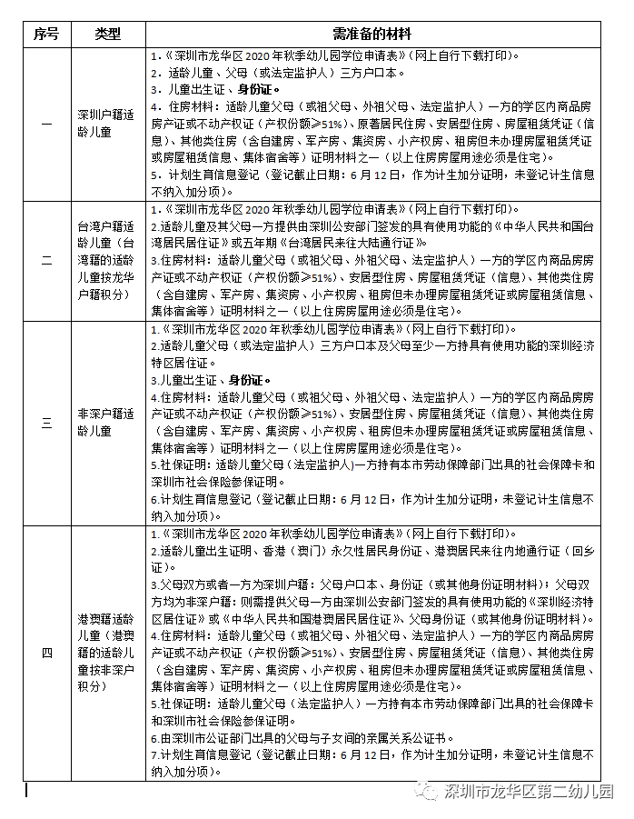 (一)幼儿入园计生信息核对业务渠道:一是网上全流程办理;二是社区工作站综合窗口现场办理。(计生信息登记不再开具纸质“计划生育证明”,将利用计划生育信息系统,实施入园儿童家长计划生育信息后台比对。审核期间,计生信息有修改的,必须在复核前,到社区工作站重新予以登记。如复核时间截止后,计生信息有修改的,结果不予采纳。为避免高峰期办理现场长时间等候,建议家长选择网上全流程办理该业务,手机下载“i深圳”APP,进行新用户注册登录并选择“区级服务”—龙华区—政务服务—个人办事,搜索“入学、入园计生信息核对、录入”事项,进行申办操作。办理进度将以短信形式通知。如收到“预审通过”和“办结”提示短信,表示该业务办理成功,无需再去现场办理;如收到“预审驳回”提示短信,则请家长按照驳回原因重新备齐申请材料、提交申办或者带齐资料前往社区工作站综合窗口现场办理。龙华区各街道社区计生部门咨询电话及地址可扫下方二维码查看。适龄儿童家长可通过注册“广东政务服务网”(http://www.gdzwfw.gov.cn/)或“i深圳”APP账号进行办理,登录后搜索“流动人口信息打印”事项,选择居住地所在街道(仅限打印本人),填报个人信息,选择邮寄,保存递交,将通过“中国邮政速递”方式邮寄给家长。(填写的居住地址必须与网格员上门登记的信息一致)。(一)《儿童入园健康检查表》(到龙华区妇幼保健院进行体检,地址:龙华区大浪办事处华旺路68号,咨询电话:29821199转2)。(二)《儿童预防接种证复印件》及《查验证明》(由辖区社康中心查验后提供证明)。(一)招生地点:资料提交初审安排在龙华区第二幼儿园一楼大厅,初审类型、录取情况公示在龙华区第二幼儿园大门口公示栏和微信公众号。(二)幼儿园初审时,家长携带各项资料原件(另备一套复印件)提交给幼儿园,幼儿园初审合格后,开具回执。对不符合入学条件的幼儿,幼儿园一律不受理其入学申请。未按时向幼儿园交齐初审材料视自动放弃学位申请,不再受理。(三)已安排学位而不按时到园注册者,幼儿园将不保留学位。(四)初审能否过关,以招生范围划分和上交申请资料的真实完整有关,在指定时间内上交资料的前提下,和上交材料的先后顺序无关。因此,递交资料时,敬请家长不要提前排队。 (五)学位申请材料真实性责任:家长对申请材料的真实性负全责,提供虚假材料的,一经查实将取消学位申请资格并记录在案,涉嫌犯罪的,移交司法机关处理。(六)非深户父母至少一方持有具有使用功能的《深圳经济特区居住证》,在深圳居住满一年、连续参加社会保险(养老保险和医疗保险)满1年。请家长查询社保缴费状态,确保养老保险和医疗保险两种险种在申请学位当年的7月份前都处于正常缴费状态(社保积分计算截止日期为2020年5月31日)。(七)租房的家长,须提交2020年6月13日前办理好的租赁凭证(信息),且要确保房屋租赁凭证(信息)在正式入园前(2020年9月)处于未过期状态(积分计算截止日期为2020年5月31日)。租房但未办理房屋租赁凭证或房屋租赁信息的,需提供2020年6月13日前与房东签订的房屋租赁合同、学区房使用授权书(附件2),以及父母(或监护人)一方的《内地居民采集表》。(八)幼儿园报名已实行学位房锁定(期限三年),学区内同一套住房(含集体宿舍、公共租赁房)用于申请学位时,在学制期间,幼儿园3年只允许一户家庭的孩子申请学位。如同一套住房有多个孩子申请学位,必须是同一父母、祖父母、外祖父母或法定监护人,招生报名系统不接受同一套住房重复申请学位。请申请阳光招生试点幼儿园学位的家长在购房或租房之前先确认该房屋学位是否已被使用(所有的住房房屋用途必须是住宅)。(九)如出现因录入信息错漏等原因导致审验结果不合格,家长须按所报幼儿园要求进行信息复核,修改后的信息将再次送相关职能部门核验,材料复核期间,家长可自行登录阳光招生网上报名系统查询最终复核结果。复核结束后,家长相关修改信息及审核结果不予采纳。(十一)家长在网上填报的信息直接影响材料审验结果和学位安排,请家长务必确保录入信息准确无误。(十二)家长在网上填报的手机号是接收幼儿园有关报名通知的主要工具,请务必保证电话畅通。