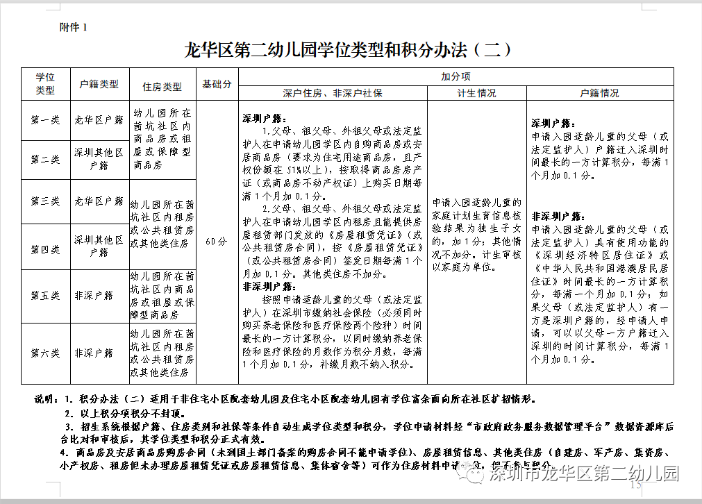 根据《广东省加强住宅小区配套幼儿园建设和管理工作的指导意见》(粤教基〔2015〕21 号)及市教育局招生要求,参照龙华区义务教育阶段招生政策,结合适龄儿童在招生地段的户籍和住房情况,龙华区幼儿园划分为六个学位类型,按照积分办法排序从高到低依次录取(详见附件1《深圳市龙华区幼儿园学位类型和积分办法(二)》)。积分办法(二)适用于非住宅小区配套幼儿园及住宅小区配套幼儿园有学位富余面向所在社区扩招情形。