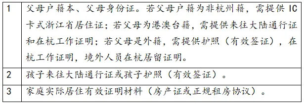 1 | 父母户籍本、父母身份证。若父母户籍为非杭州籍,需提供IC卡式浙江省居住证;若父母为港澳台籍,需提供来往大陆通行证和在杭工作证明;若父母是外籍,需提供护照(有效签证),在杭工作证明,境外人员在杭居留证明。 |