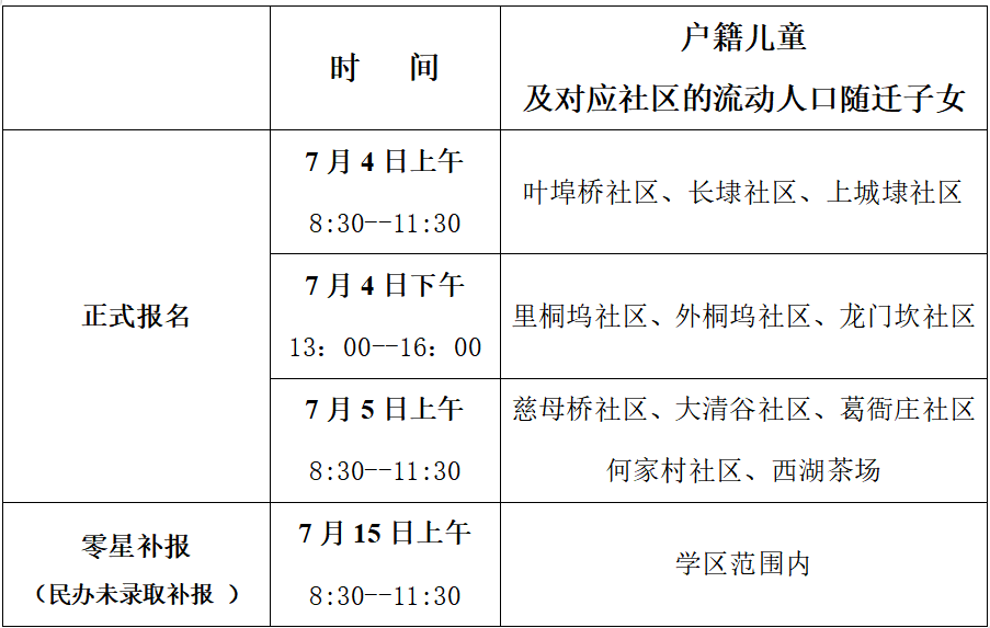 1.公、民办小学实行网上同步报名。7月11日—13日通过“杭州市小学一年级入学管理系统”,线上填报相关信息并完成报名。网上报名方式:通过“浙里办”手机APP或“浙江政务服务网”。