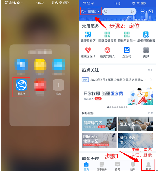 浙里办(左上方定位按钮将位置定位在“杭州市-富阳区”);