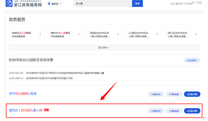 在输入框内输入“幼儿园”搜索,找到“富阳区丨幼儿园儿童入园”,点击“在线办理”按钮。