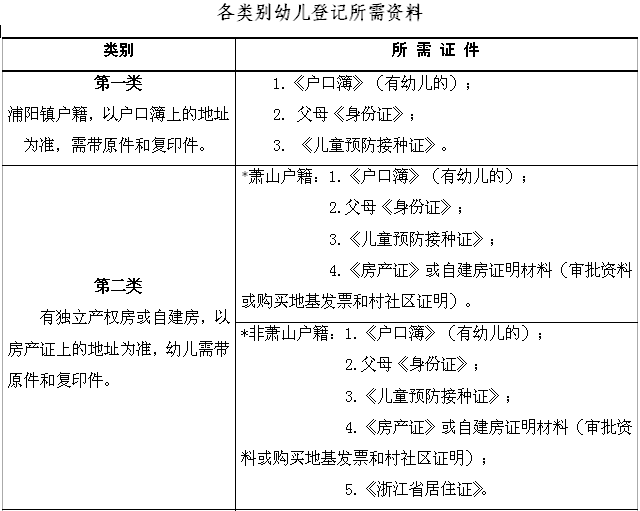 非浦阳镇户籍,法定监护人(一般指父母)在浦阳镇拥有独立产权房(住宅性质,《房产证》办理时间为2020年5月31日前)或自建房的适龄幼儿。根据新生户籍,又分为三批:萧山户籍(A批)、杭州其余十区户籍(B批)、非杭州市区户籍(C批)。产权房以《房产证》为凭证,办理时间为2020年5月31日之前;自建房以审批资料或购买地基发票和村(社区)证明为凭证。