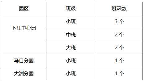 三个园区共计划招收5个小班。其中下涯中心园区招收3个小班;马目分园招收1个小班;大洲分园招收1个小班。