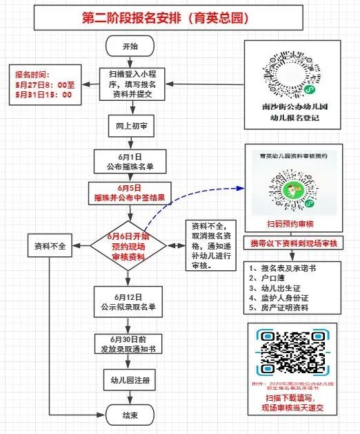 1.报名时间和对象:2020年5月27日8:00~5月31日15:00,育英总园开始网上报名,招生对象为符合“南沙街户籍”、符合广州市义务教育阶段政策性照顾资格的非广州市户籍适龄幼儿和大湾区南沙人才卡持卡人的适龄子女。