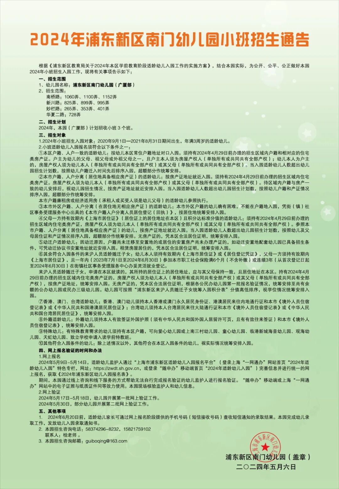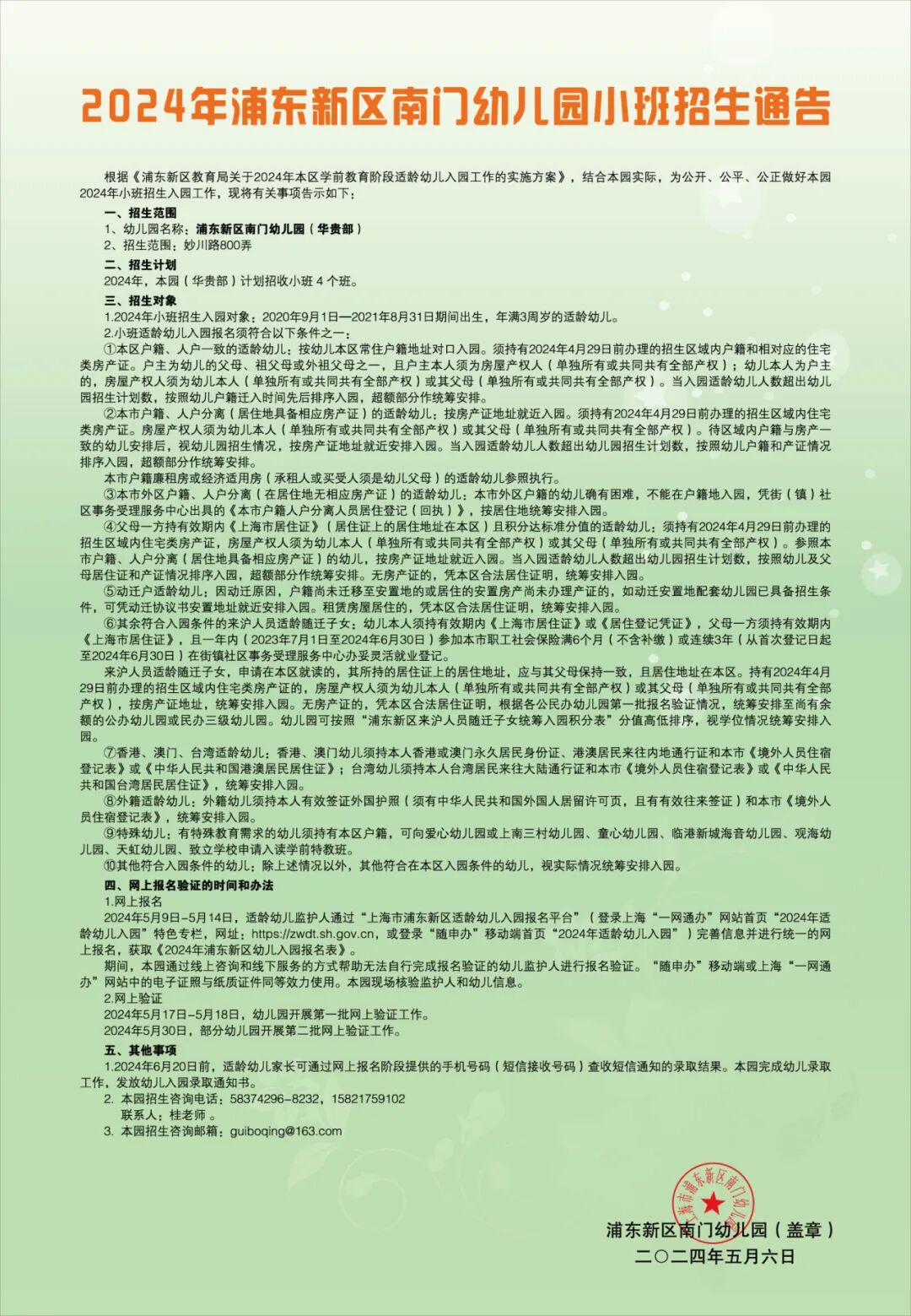 根据《浦东新区教育局关于2021年本区学前教育阶段适龄幼儿入园工作的实施意见》,结合本园实际,为公开、公平、公正做好本园2021年招生入园工作,现将有关事项告示如下: