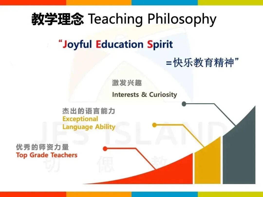 J.E.S 是“Joyful Education Spirit快乐教育精神”的缩写。致力于让孩子从小就能感受到‘自觉’学习的快乐。JES采用国外先进而独特的以素质教育为主题的综合英语教育的模式,结合中国的实际国情和需求,为孩子们营造轻松温暖的双语学习氛围,并致力于寓教于乐的互动式、多元化课程、培养多元化的儿童发展,致力于2至6岁儿童的因势利导,为孩子成长过程中的个性化发展打下坚实基础。