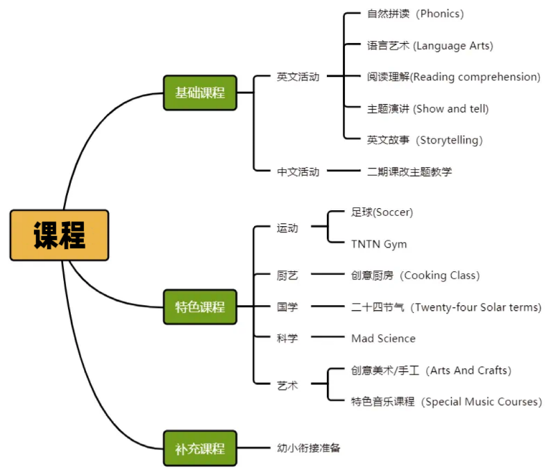 通过丰富的课程和精彩的互动实践,使孩子的习惯和习得在游戏中并行获得(Learn Through Play),在快乐的氛围中自然提升幼儿的英文能力。课程分为以下大类: