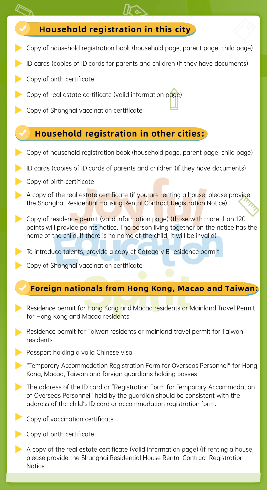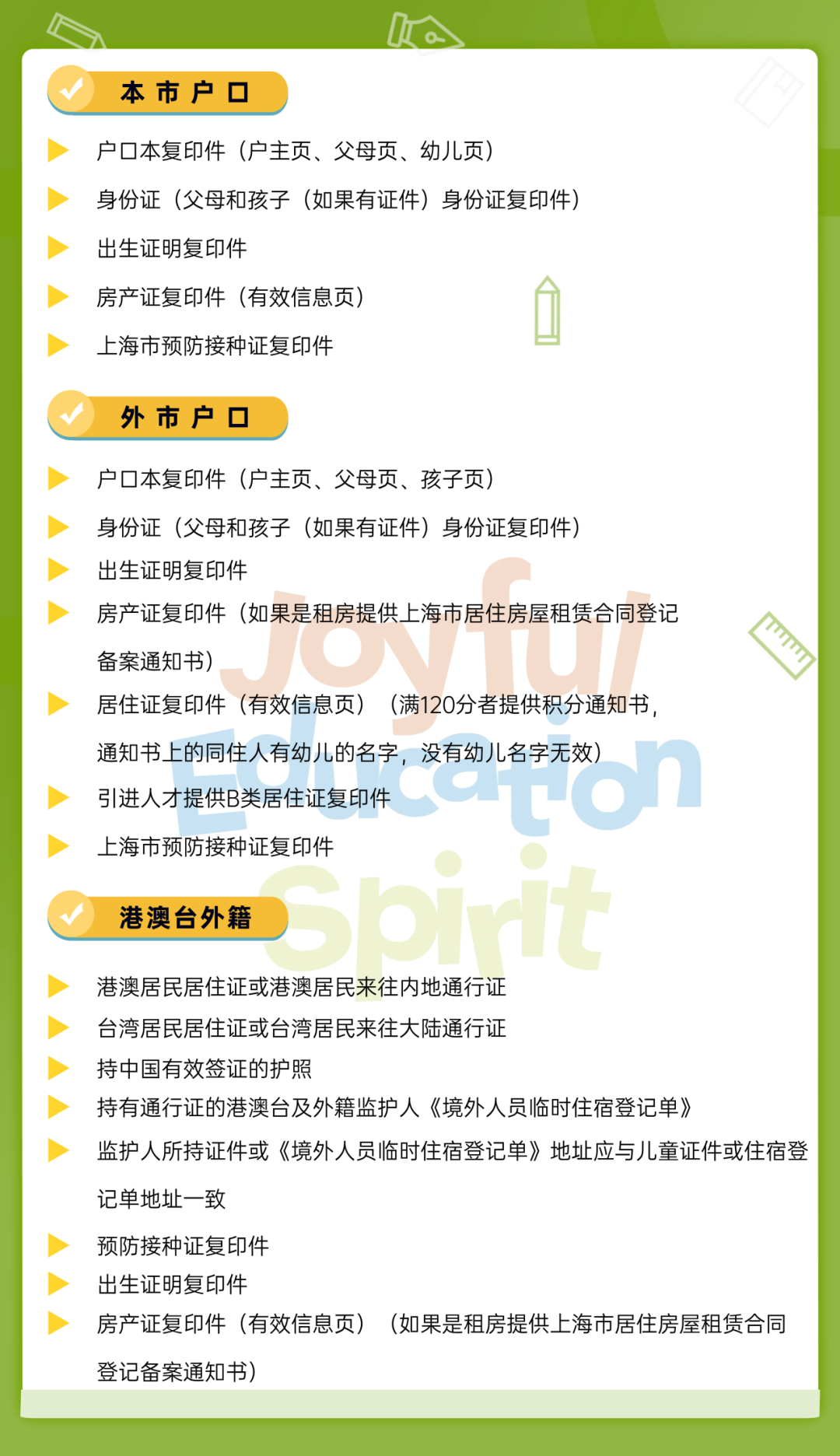 验证材料清单 一、市级平台获取的《2024幼儿信息登记表》及登记编号。 二、户籍材料,根据户口性质进行对应准备,三选一(可以打上水印,标注只作为报名使用) 一、The "2024 Child Information Registration Form" and registration number obtained from the municipal platform. 二、Household registration materials, prepare accordingly according to the nature of the household registration, choose one of the three (can be watermarked, marked only for registration)