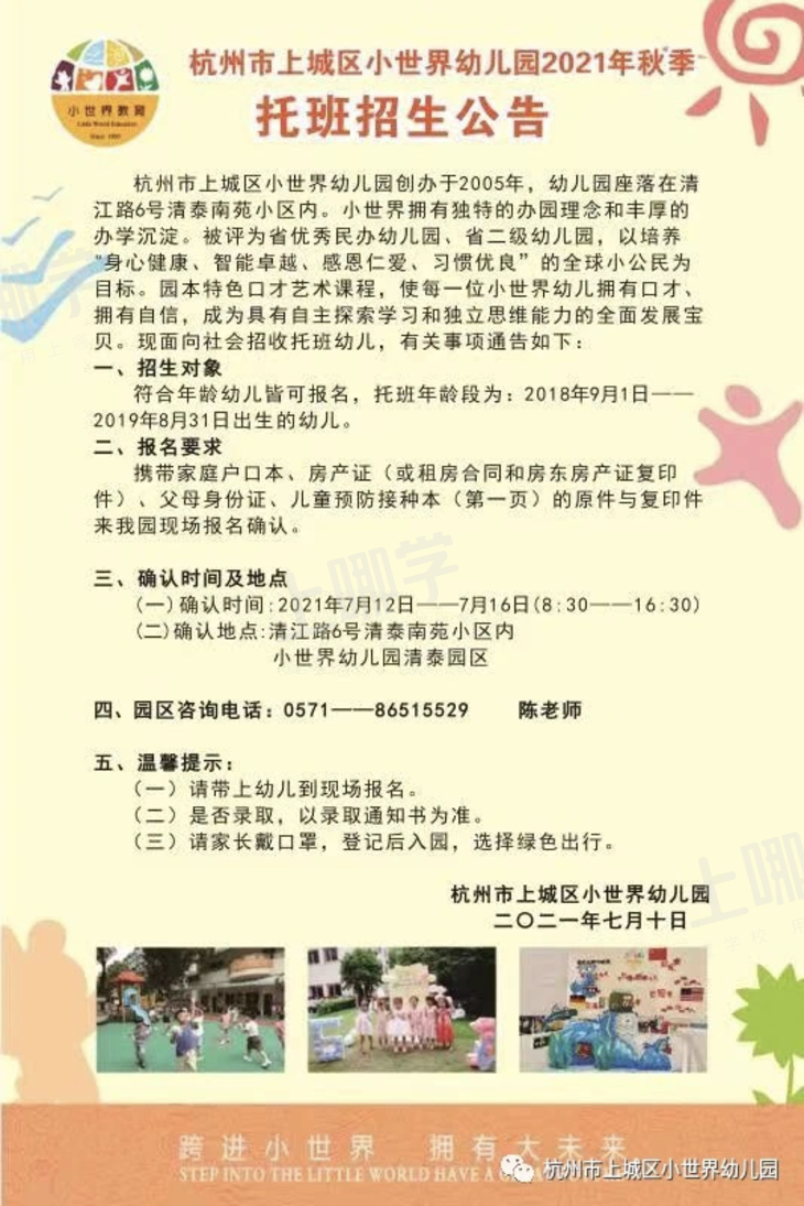 幼儿园基本情况 (一)办园性质:民办幼儿园 (二)等级:浙江省二级幼儿园 (三)收费标准: 1.保育费: 1000 元/月; 2.伙食费:13 元/天; 3.代管费:100 元/学期。 (四)招生计划:小班3个班; 招生对象 2018年9月1日——2019年8月31日出生,且符合上城区入园条件的儿童。 招生服务范围 望江街道所辖的清泰门社区、莫邪塘社区、兴隆社区。可接受上城区其他地区符合条件的儿童报名 报名所需材料 (一)上城区户籍儿童。需随带户籍儿童家庭户口本、父母双方身份证、房产证。市区集体户家庭儿童另需提供实际居住证明(房产证或租赁合同),市区拆迁户需提供拆迁协议及实际居住证明(房产证或租赁合同),以上材料均需原件。 (二)符合上城区入园条件的流动人口随迁子女,提供儿童家庭户籍本、父母双方身份证、房产证或租赁证明,儿童本人的居住证原件。 暂未持有居住证,但预计2022年8月31日前能取得的,应在报名现场单独登记,待取得居住证后,需在2022年8月31日前补交居住证等材料核验。 (三)其他符合上城区入园条件的儿童,如驻上城区部队的随军子女、各类人才子女、港澳台和外籍儿童等,家长需另提供相关的证明材料和实际居住证明(房产证或租赁合同)原件。 (四)未进行网上信息采集、登记信息比对未成功或登记信息有变更的幼儿,均需现场提供儿童家庭户口本、父母双方身份证,房产证(租赁证明)、适龄儿童本人的居住证、人才证等相应的证明材料原件和复印件。 (五)所有报名材料和申报信息均须真实有效,如发现弄虚作假,将取消录取资格。 录取方式 根据本幼儿园的招生计划,按照“住、户一致优先”的原则录取,如幼儿园服务区范围内小班适龄儿童报名人数超过招生计划数,由上城区教育局统筹安排。 报名方式 五、报名时间 2022年6月4日、6月5日 (星期六、星期日) 上午:8:30---12:00 下午:13:00---16:30 六、报名地点 上城区清江路6号清泰南苑小区内小世界幼儿园 七、幼儿园咨询电话 0571-86515529, 13656819845(微信同号) 八、注意事项 凡在本幼儿园报名的儿童,是否录取请以幼儿园的录取通知为准,幼儿园会在报名后两周内通知录取结果。未进行网上信息采集、登记信息比对未成功或登记信息有变更的幼儿,以及6月6日至8月31日期间取得居住证的幼儿,录取通知相应顺延。 温馨提示 (一)疫情期间实施错峰报名安排,请在规定时间来园报名,切勿提前排队等候,录取结果与排队先后顺序无关; (二)报名时需如实申报幼儿身心健康状况,可以不带幼儿; (三)每户家庭一名家长携带资料到园报名,需全程佩戴口罩,自觉配合幼儿园防疫管理要求; (四))逾期未到现场确认的,视作自动放弃入园。 小世界 ⦁ 爱 满