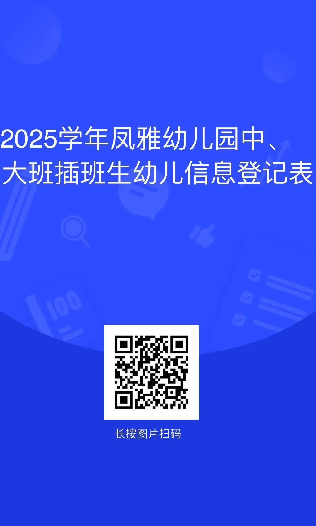 新 学 期 新 气 象 招生公告 ~凤雅幼儿园欢迎你~ 依据《关于做好2023年青浦区学前教育阶段适龄幼儿入园工作的通知》的要求,坚持“公开、公正”的原则,按《青浦区2023学年度幼儿园教育事业计划》执行要求设定班级数和班额数,按照各项工作的时间节点,一网通办,努力做好华新镇公办幼儿园2023学年的招生工作。具体安排如下: 招生区域、对象与条件 招生区域: 招生对象: 2019年9月1日~2020年8月31日期间出生的身体健康(无慢性传染病)、可正常参加集体活动,并符合以下条件之一的适龄幼儿。 招生条件: 01 本市幼儿 ★★备注: (1)户口迁入、房产办理认定截止时间原则上为2023年4月30日。 (2)直系亲属指的是幼儿的爸爸妈妈、爷爷奶奶或外公外婆。 (3)预售合同加大额发票,等同于房产证,同类条件排在房产证的后面。 02 非本市幼儿(自主招生) ★★备注: (1)幼儿持有效期内《上海市居住证》或《居住登记凭证》,父母一方须持有效期内《上海市居住证》且一年内(2022年7月1日至2023年6月30日)参加本市职工社会保险满6个月的证明(不含补缴,政策允许的补缴除外),或连续3年(从首次登记日起至2023年6月30日)在街镇社区事务受理服务中心办妥灵活就业登记。 (2)预售合同加大额发票,等同于房产证,同类条件排在房产证的后面。 招生人数及收费标准: 1.本园共招收5个小班,共计125名幼儿。 2.收费标准:保育教育费175元/月。代办服务性收费,按需征询后收取。 报名流程 (一)招生公示 5月6日,我园向社会公布本园招生简章。 (二)网上报名 5月8日-12日,家长登录“青浦区适龄幼儿入园报名平台”填报报名信息、提交报名。(家长对入园报名平台上所填信息的真实性负责,对提供虚假信息的,将实行“一票否决”) (三)短信告知 5月25日,我园将向网上验证通过的幼儿家长发送验证通过短信。 (四)补充验证 5月27日、28日,我园根据需要进行补充验证。 (五)录取通知 6月24日,发放第一批入园通知书(本市户籍幼儿)。 7月8日,发放第二批入园通知书。 备注: 按照招生计划数和招生条件依次录取,录满为止。如遇条件相同,将根据房产证年限依次录取。接到电话通知的幼儿方被正式录取,并请家长来园领取入园通知书。 关于中大班补充人园 (一)中、大班转园或插班与招生工作同步进行,家长按照我园招生公告的条件。 1.5月8日至5月12日期间,扫描以下二维码进行报名,请务必按照提示将各类信息填写完整,以免影响正常报名。 2.材料初步审核后,于5月27日、5月28日凭幼儿园电话通知到园进行现场报名登记和现场审核。原则上中途不再办理转园手续。 3.转园或插班的条件:2017年9月1日至2018年8月31日期间出生的大班年龄段幼儿。入园条件参照适龄幼儿招生条件,视具体情况依次满足。上一年度因身体状况等特殊原因延迟入园的幼儿,优先满足。 (二)中大班补充入园名额: 中班——15人;大班——36人。 招生咨询电话: 69775180 联系人: 朱老师 幼儿园地址: 凤雅路999号