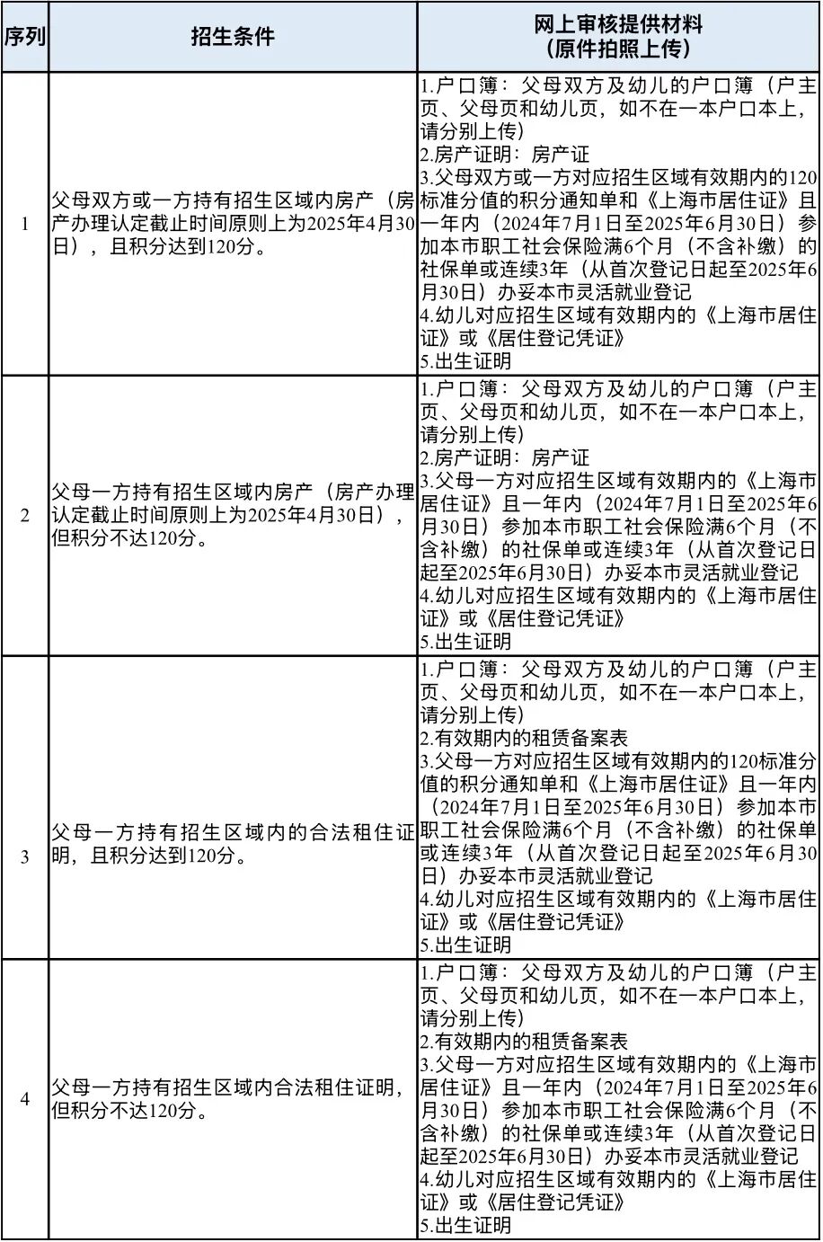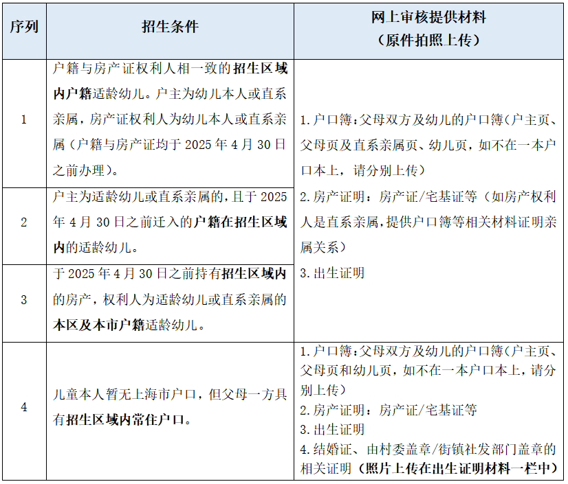1 | 幼儿户籍与房产证权利人相一致(户主为幼儿本人或直系亲属,且户籍与房产证均于2022年6月30日之前办理)的华新镇户籍的适龄幼儿。 | 1.户口簿:父母双方及幼儿的户口簿(户主页、父母页和幼儿页,如不在一本户口本上,请分别上传) 2.房产证明:房产证/宅基证等 3.出生证明 |